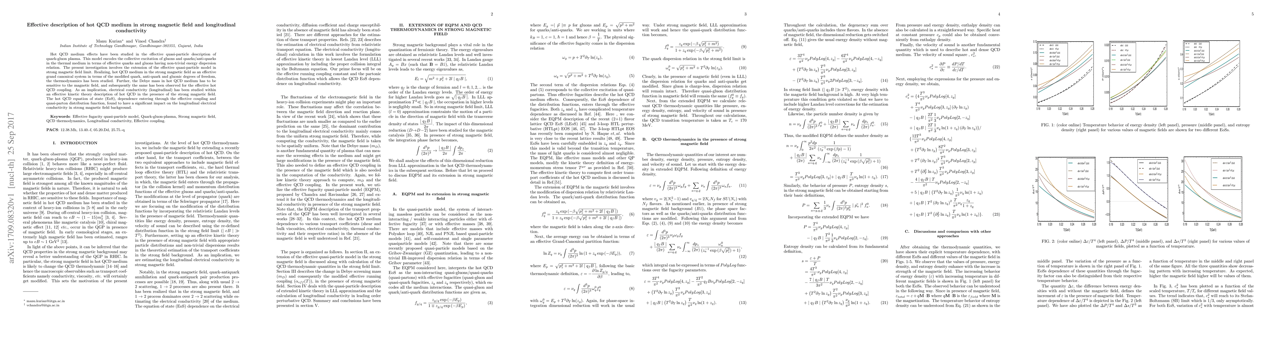 Hot QCD medium effects have been studied in the effective quasi-particle description of quark-gluon plasma. This model encodes the collective excitation of gluons and quarks/anti-quarks in the thermal medium in terms of effective quarks and gluons having non-trivial energy dispersion relation. The present investigation involves the extension of the effective quasi-particle model in strong magnetic field limit. Realizing, hot QCD medium in the strong magnetic field as an effective grand canonical system in terms of the modified quark, anti-quark and gluonic degrees of freedom, the thermodynamics has been studied. Further, the Debye mass in hot QCD medium has to be sensitive to the magnetic field, and subsequently the same has been observed for the effective hot QCD coupling. As an implication, electrical conductivity (longitudinal) has been studied within an effective kinetic theory description of hot QCD in the presence of the strong magnetic field. The hot QCD equation of state (EoS), dependence entering through the effective coupling and quasi-parton distribution function, found to have a significant impact on the longitudinal electrical conductivity in strong magnetic field background.