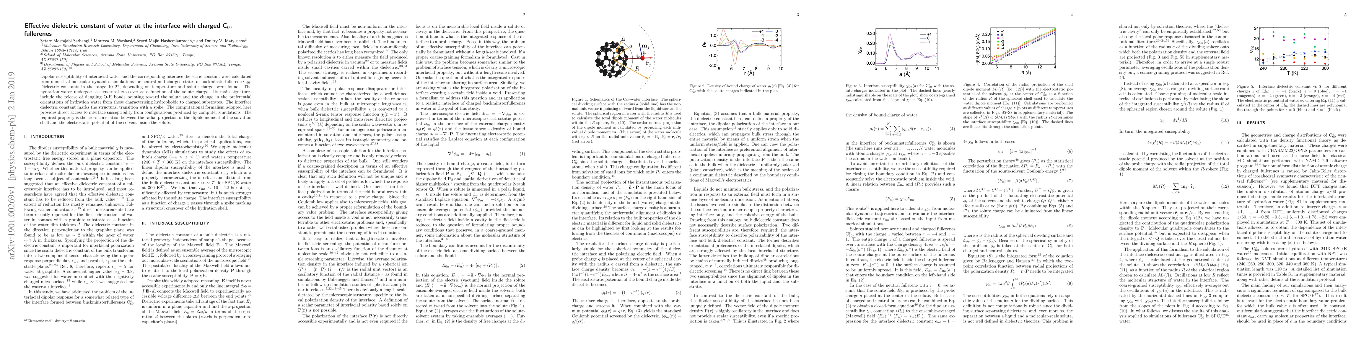 This study uses molecular dynamics simulations to determine the effective dielectric constant of water at the interface with neutral and charged C$_{60}$ fullerenes. The dielectric constants range from 10 to 22, influenced by temperature and solute charge, with a notable structural transition in hydration water marked by a spike in the interface dielectric constant.