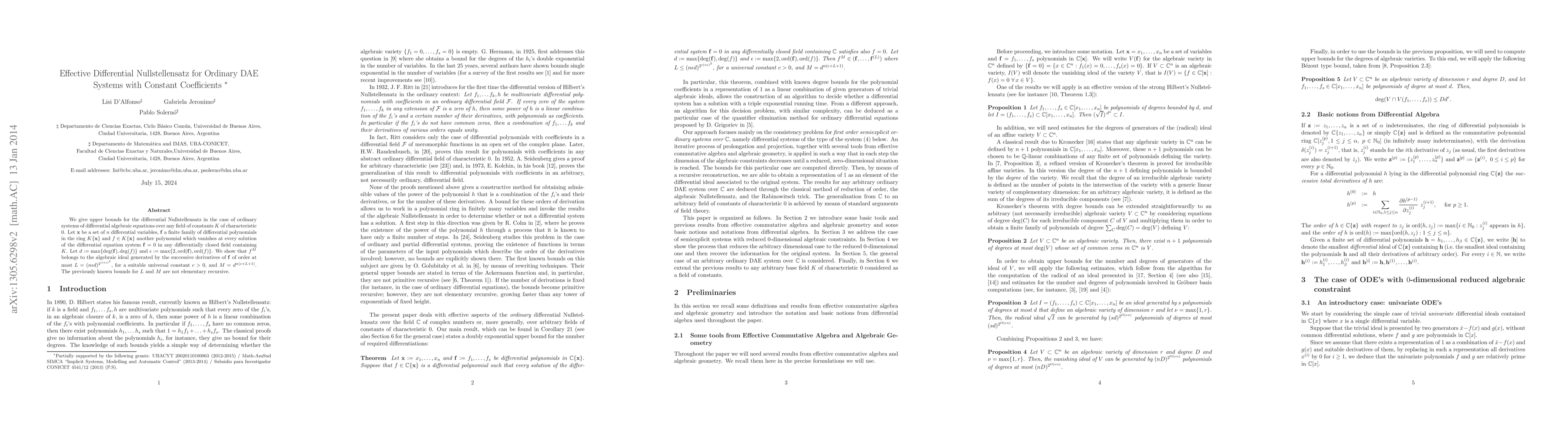 Researchers developed a new bound for the differential Nullstellensatz in ordinary DAE systems with constant coefficients, improving previously non-elementary recursive bounds.