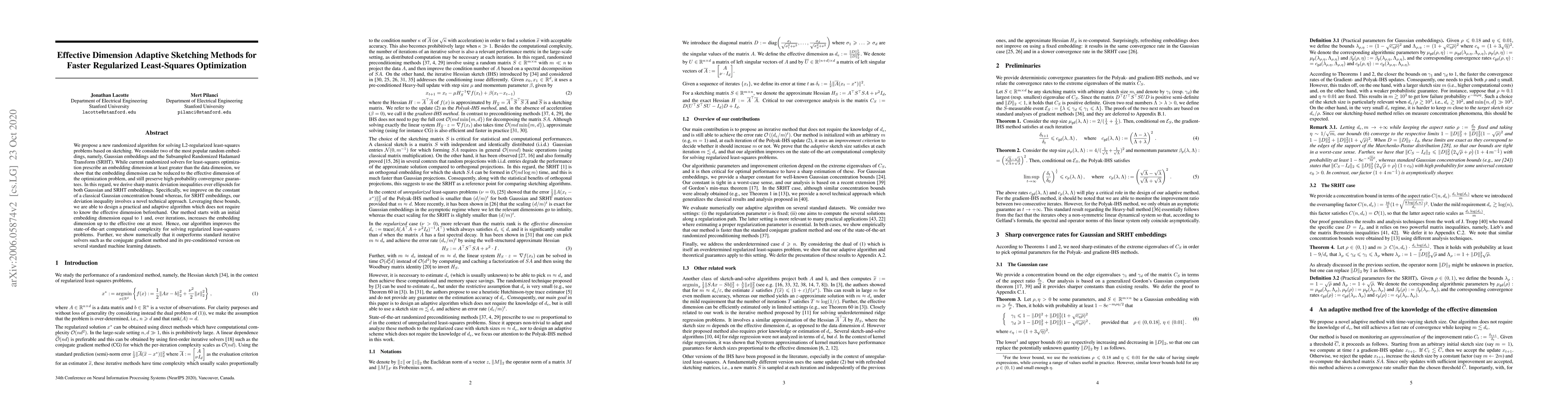 We propose a new randomized algorithm for solving L2-regularized least-squares problems based on sketching. We consider two of the most popular random embeddings, namely, Gaussian embeddings and the Subsampled Randomized Hadamard Transform (SRHT). While current randomized solvers for least-squares optimization prescribe an embedding dimension at least greater than the data dimension, we show that the embedding dimension can be reduced to the effective dimension of the optimization problem, and still preserve high-probability convergence guarantees. In this regard, we derive sharp matrix deviation inequalities over ellipsoids for both Gaussian and SRHT embeddings. Specifically, we improve on the constant of a classical Gaussian concentration bound whereas, for SRHT embeddings, our deviation inequality involves a novel technical approach. Leveraging these bounds, we are able to design a practical and adaptive algorithm which does not require to know the effective dimension beforehand. Our method starts with an initial embedding dimension equal to 1 and, over iterations, increases the embedding dimension up to the effective one at most. Hence, our algorithm improves the state-of-the-art computational complexity for solving regularized least-squares problems. Further, we show numerically that it outperforms standard iterative solvers such as the conjugate gradient method and its pre-conditioned version on several standard machine learning datasets.