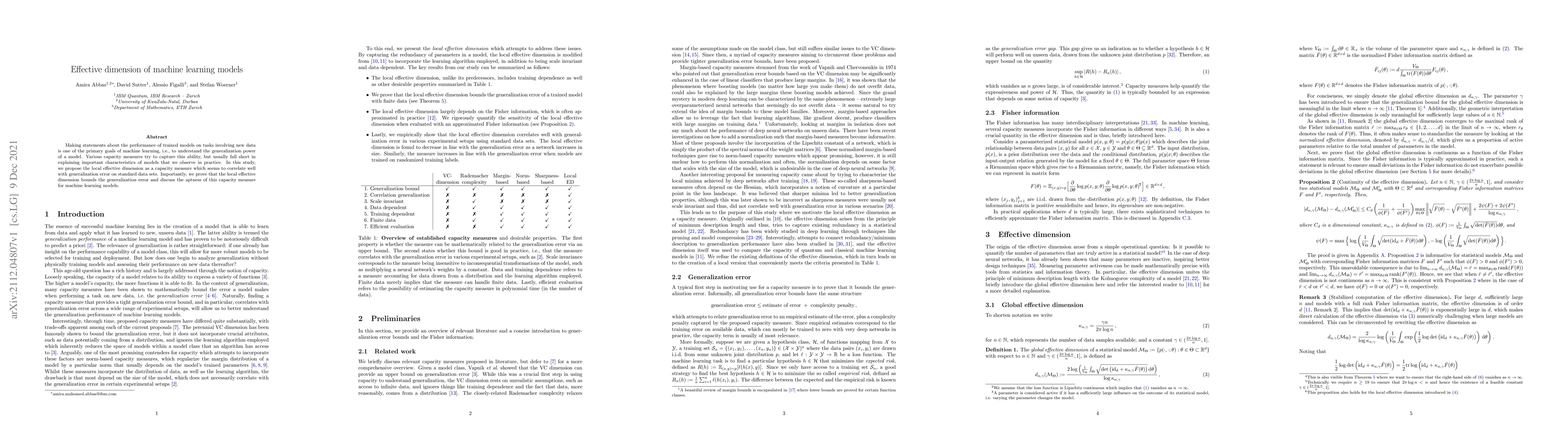 The paper introduces the local effective dimension as a capacity measure for machine learning models, proving it bounds the generalization error and correlates with it on standard datasets. It discusses the local effective dimension's dependence on the training algorithm and its scale invariance.