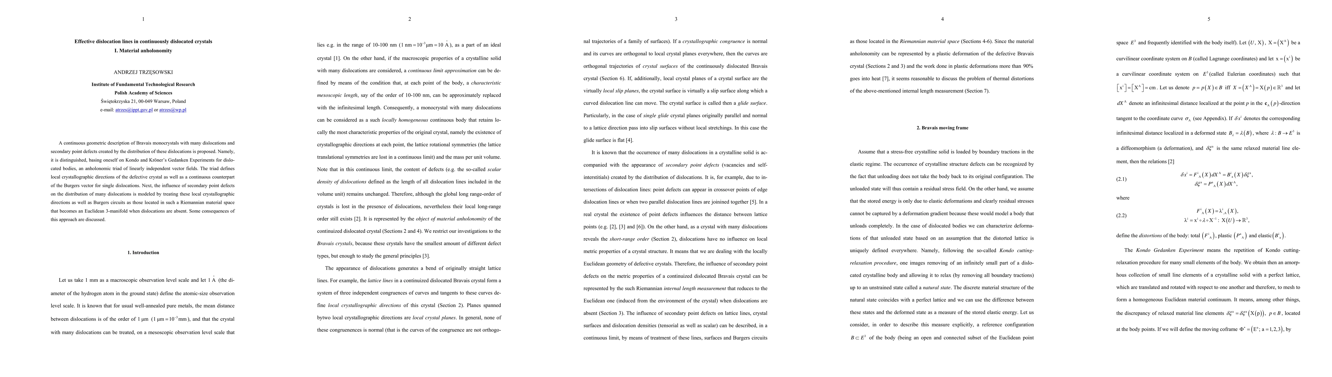 A continuous geometric description of Bravais monocrystals with many dislocations and secondary point defects created by the distribution of these dislocations is proposed. Namely, it is distinguished, basing oneself on Kondo and Kroners Gedanken Experiments for dislocated bodies, an anholonomic triad of linearly independent vector fields. The triad defines local crystallographic directions of the defective crystal as well as a continuous counterpart of the Burgers vector for single dislocations. Next, the influence of secondary point defects on the distribution of many dislocations is modeled by treating these local crystallographic directions as well as Burgers circuits as those located in such a Riemannian material space that becomes an Euclidean 3-manifold when dislocations are absent. Some consequences of this approach are discussed.