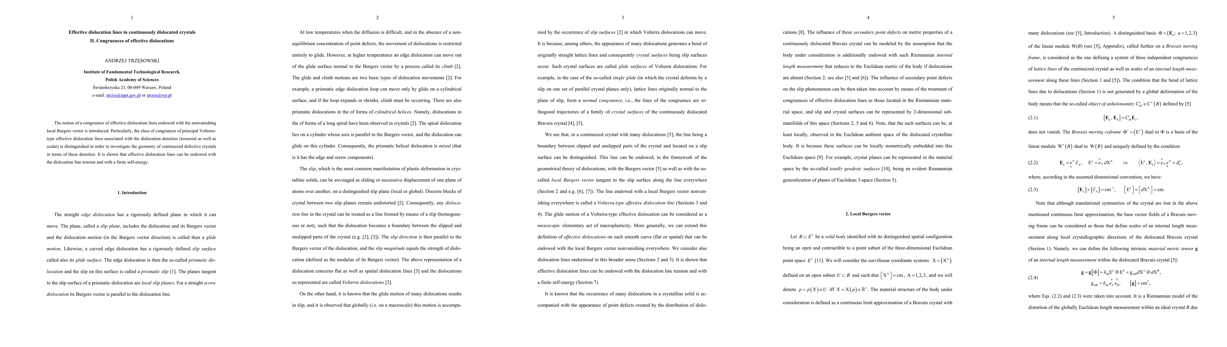 This paper introduces the concept of congruences of effective dislocation lines with nonvanishing local Burgers vectors, focusing on principal Volterra-type effective dislocations linked to dislocation densities. It explores the geometry of defective crystals using these densities and demonstrates that effective dislocation lines possess dislocation line tension and finite self-energy.