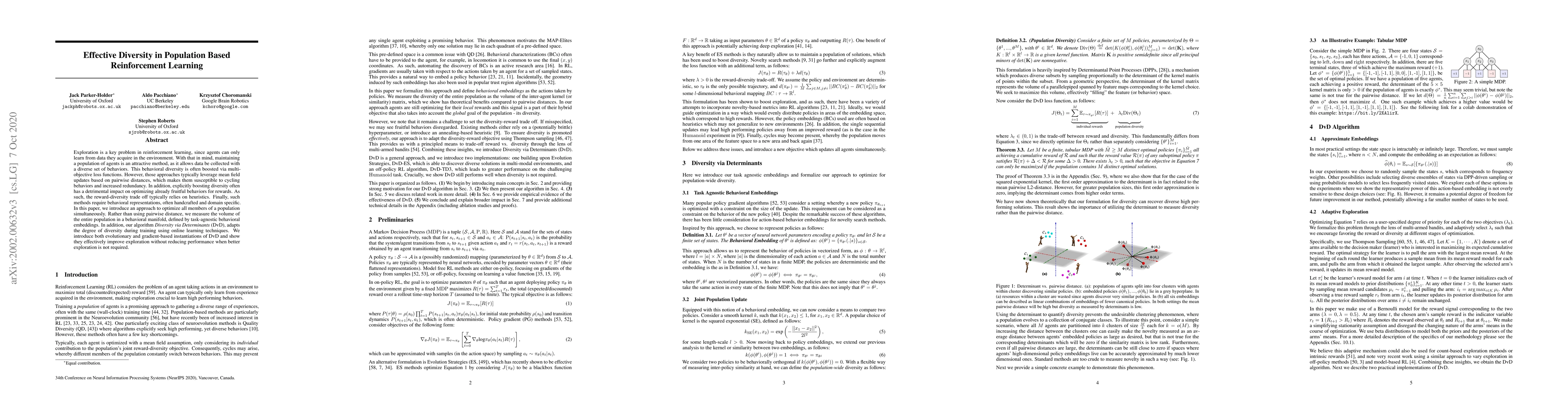 Exploration is a key problem in reinforcement learning, since agents can only learn from data they acquire in the environment. With that in mind, maintaining a population of agents is an attractive method, as it allows data be collected with a diverse set of behaviors. This behavioral diversity is often boosted via multi-objective loss functions. However, those approaches typically leverage mean field updates based on pairwise distances, which makes them susceptible to cycling behaviors and increased redundancy. In addition, explicitly boosting diversity often has a detrimental impact on optimizing already fruitful behaviors for rewards. As such, the reward-diversity trade off typically relies on heuristics. Finally, such methods require behavioral representations, often handcrafted and domain specific. In this paper, we introduce an approach to optimize all members of a population simultaneously. Rather than using pairwise distance, we measure the volume of the entire population in a behavioral manifold, defined by task-agnostic behavioral embeddings. In addition, our algorithm Diversity via Determinants (DvD), adapts the degree of diversity during training using online learning techniques. We introduce both evolutionary and gradient-based instantiations of DvD and show they effectively improve exploration without reducing performance when better exploration is not required.