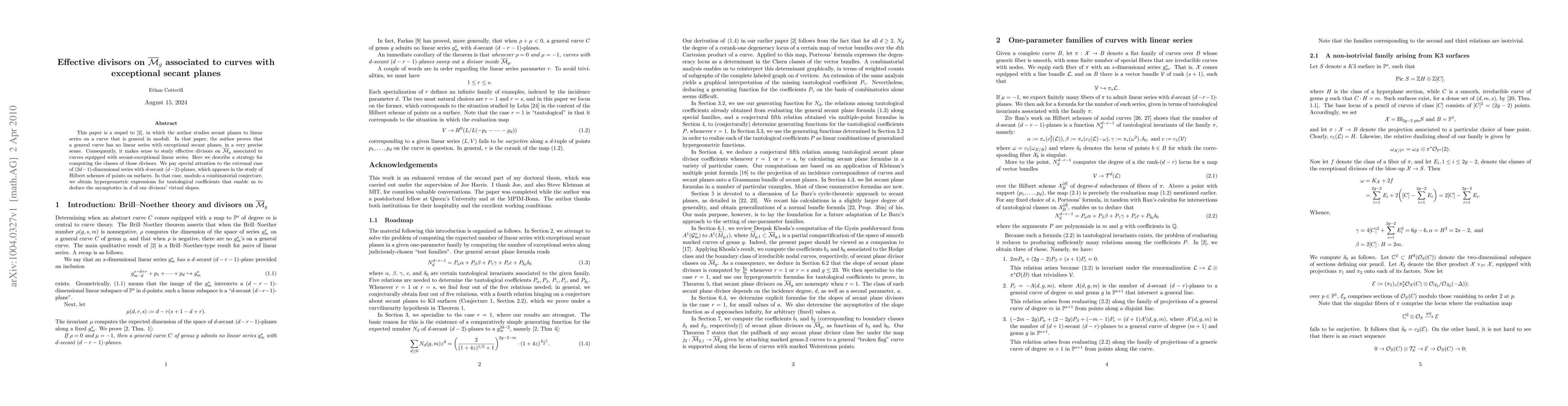 This paper is a sequel to \cite{C}, in which the author studies secant planes to linear series on a curve that is general in moduli. In that paper, the author proves that a general curve has no linear series with exceptional secant planes, in a very precise sense. Consequently, it makes sense to study effective divisors on $\ov{\mc{M}}_g$ associated to curves equipped with secant-exceptional linear series. Here we describe a strategy for computing the classes of those divisors. We pay special attention to the extremal case of $(2d-1)$-dimensional series with $d$-secant $(d-2)$-planes, which appears in the study of Hilbert schemes of points on surfaces. In that case, modulo a combinatorial conjecture, we obtain hypergeometric expressions for tautological coefficients that enable us to deduce the asymptotics in $d$ of our divisors' virtual slopes.