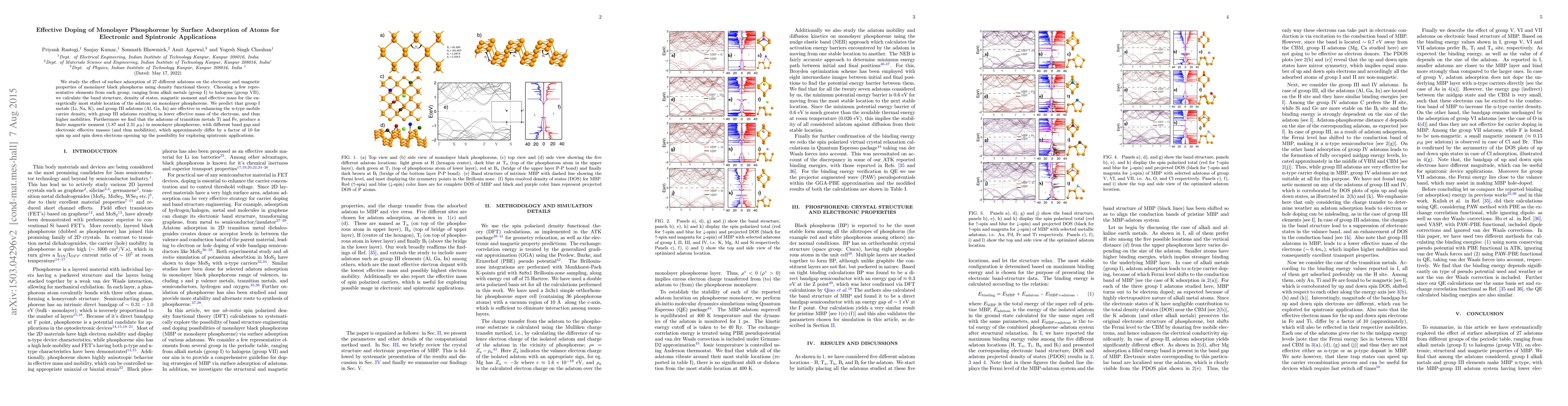 This study investigates the impact of surface adsorption of 27 different adatoms on monolayer phosphorene's electronic and magnetic properties, revealing that group I metals and group III adatoms enhance n-type carrier density and electron mobility, while transition metals Ti and Fe introduce magnetic moments, suggesting potential for spintronic applications.