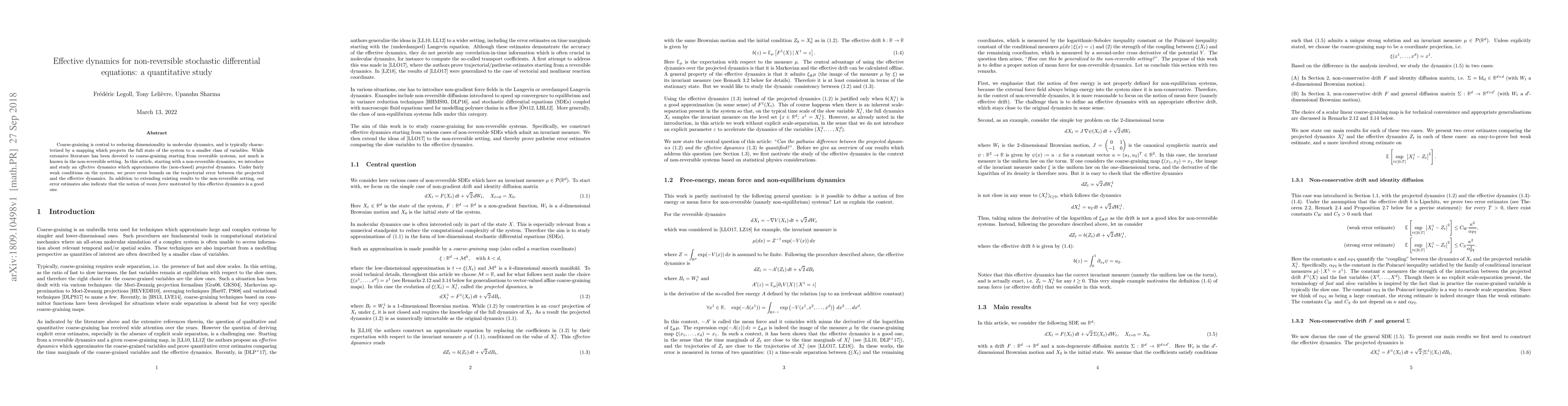 Researchers develop an effective dynamics for non-reversible stochastic differential equations, providing error bounds and a good approximation of the projected dynamics under weak conditions. This work extends existing results to non-reversible systems and provides insight into the notion of mean force motivated by this effective dynamics.