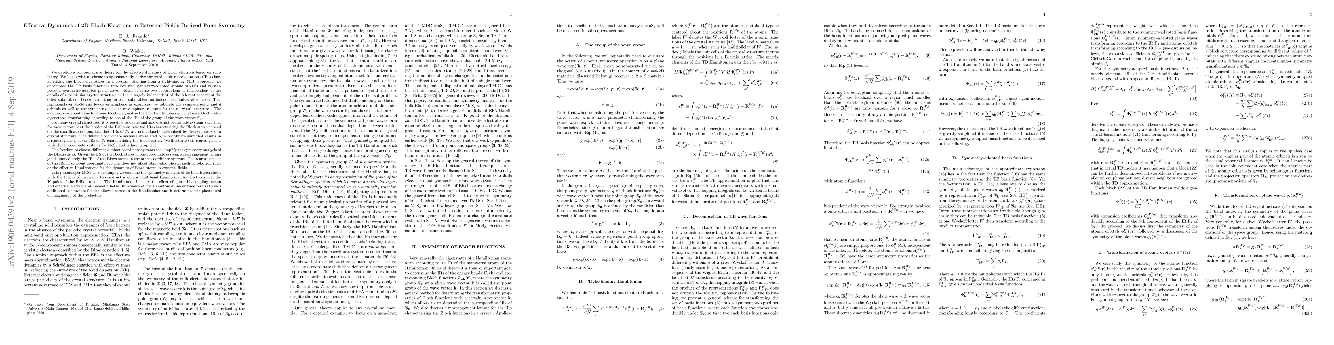 This paper develops a comprehensive theory for the effective dynamics of Bloch electrons based on symmetry, systematically deriving irreducible representations for Bloch functions. It uses symmetry-adapted basis functions to block-diagonalize the tight-binding Hamiltonian, illustrating the effect of coordinate systems on the irreducible representations and constructing a multiband Hamiltonian for monolayer MoS$_2$ that includes spin-orbit coupling, strain, and external fields.