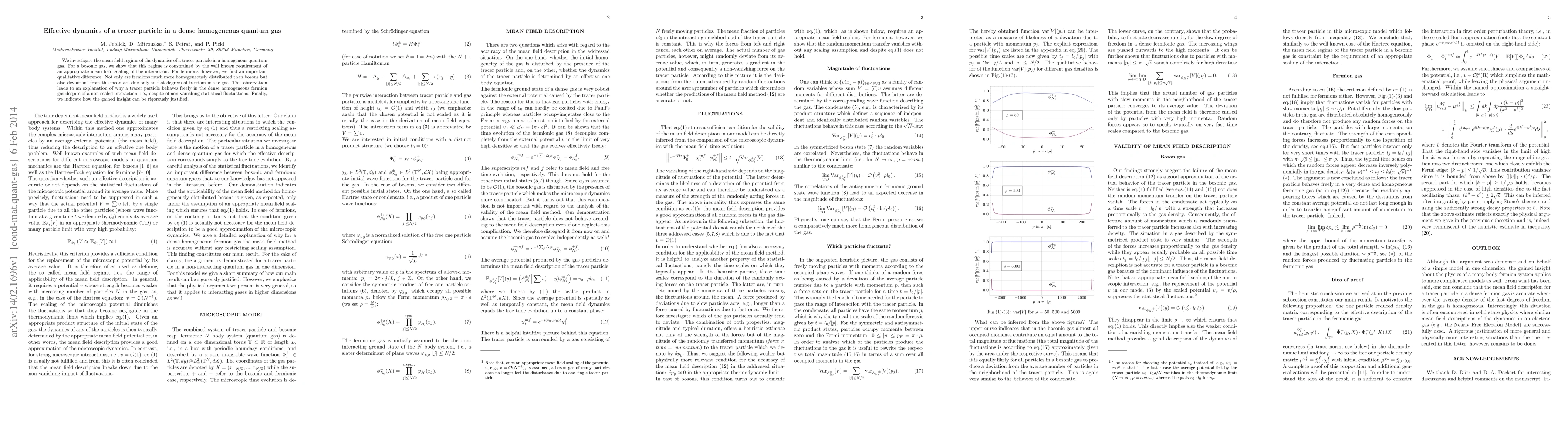 We investigate the mean field regime of the dynamics of a tracer particle in a homogenous quantum gas. For a bosonic gas, we show that this regime is constrained by the well known requirement of an appropriate mean field scaling of the interaction. For fermions, however, we find an important qualitative difference. Not only are fermions much more homogeneously distributed than bosons but also deviations from the mean are due only to fast degrees of freedom in the gas. This observation leads to an explanation of why a tracer particle behaves freely in the dense homogeneous fermion gas despite of a non-scaled interaction, i.e., despite of non-vanishing statistical fluctuations. Finally, we indicate how the gained insight can be rigorously justified.