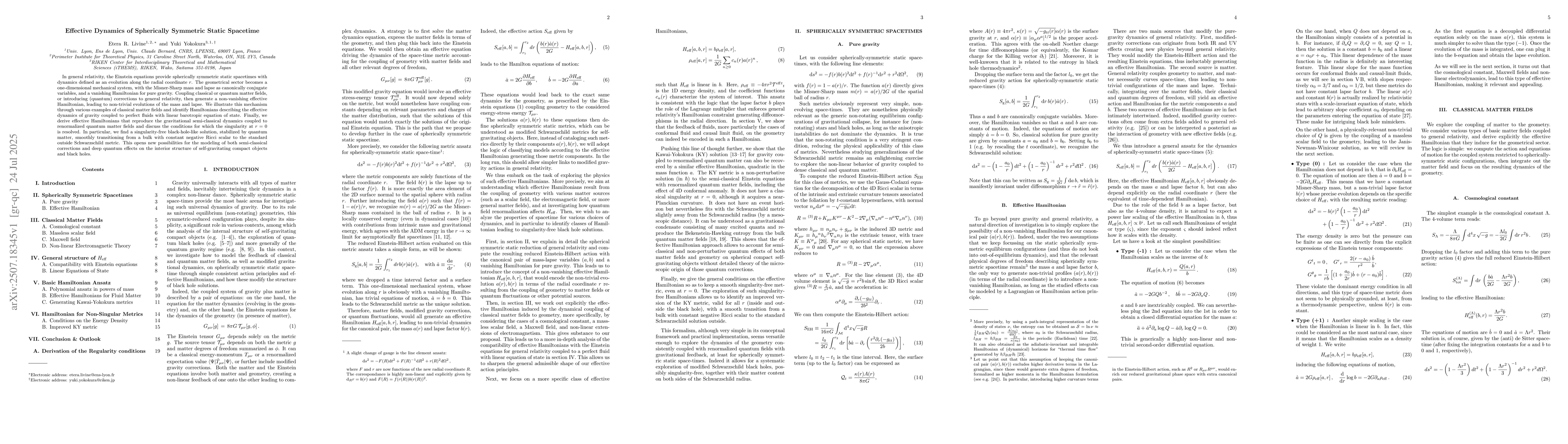 In general relativity, the Einstein equations provide spherically symmetric static spacetimes with dynamics defined as an evolution along the radial coordinate $r$. The geometrical sector becomes a one-dimensional mechanical system, with the Misner-Sharp mass and lapse as canonically conjugate variables, and a vanishing Hamiltonian for pure gravity. Coupling classical or quantum matter fields, or introducing (quantum) corrections to general relativity, then generate a non-vanishing effective Hamiltonian, leading to non-trivial evolutions of the mass and lapse. We illustrate this mechanism through various examples of classical matter fields and identify Hamiltonians describing the effective dynamics of gravity coupled to perfect fluids with linear barotropic equation of state. Finally, we derive effective Hamiltonians that reproduce the gravitational semi-classical dynamics coupled to renormalized quantum matter fields and discuss the conditions for which the singularity at $r=0$ is resolved. In particular, we find a singularity-free black-hole-like solution, stabilized by quantum matter, smoothly transitioning from a bulk with constant negative Ricci scalar to the standard outside Schwarzschild metric. This opens new possibilities for the modeling of both semi-classical corrections and deep quantum effects on the interior structure of self-gravitating compact objects and black holes.