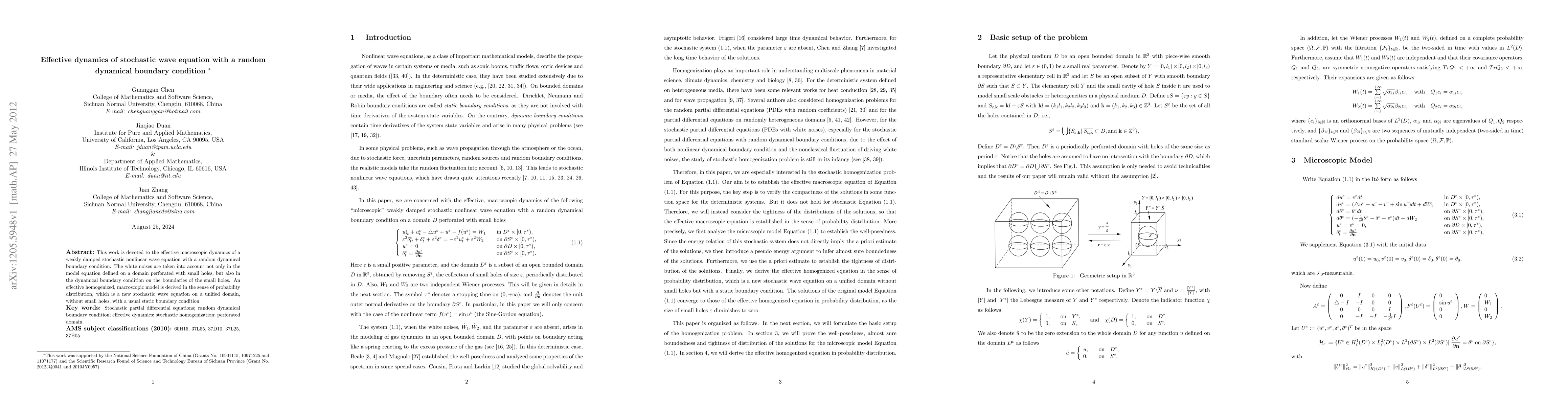 This paper derives an effective macroscopic model for a weakly damped stochastic nonlinear wave equation with random boundary conditions and white noise, resulting in a homogenized stochastic wave equation on a unified domain. The new model simplifies the dynamics by eliminating small holes and static boundary conditions.