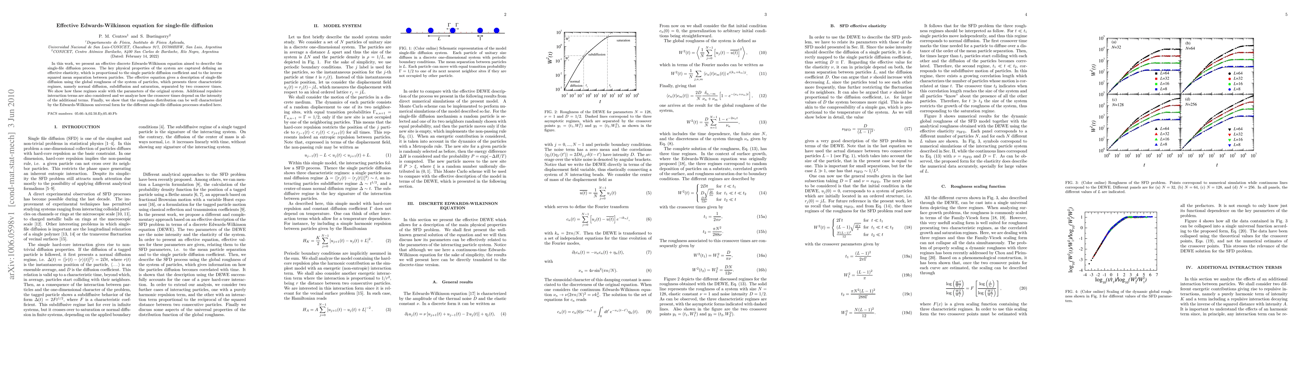 This paper develops an effective discrete Edwards-Wilkinson equation to describe single-file diffusion, capturing key physical properties through an effective elasticity. The model identifies three diffusion regimes and analyzes how additional repulsive interactions influence crossover times.