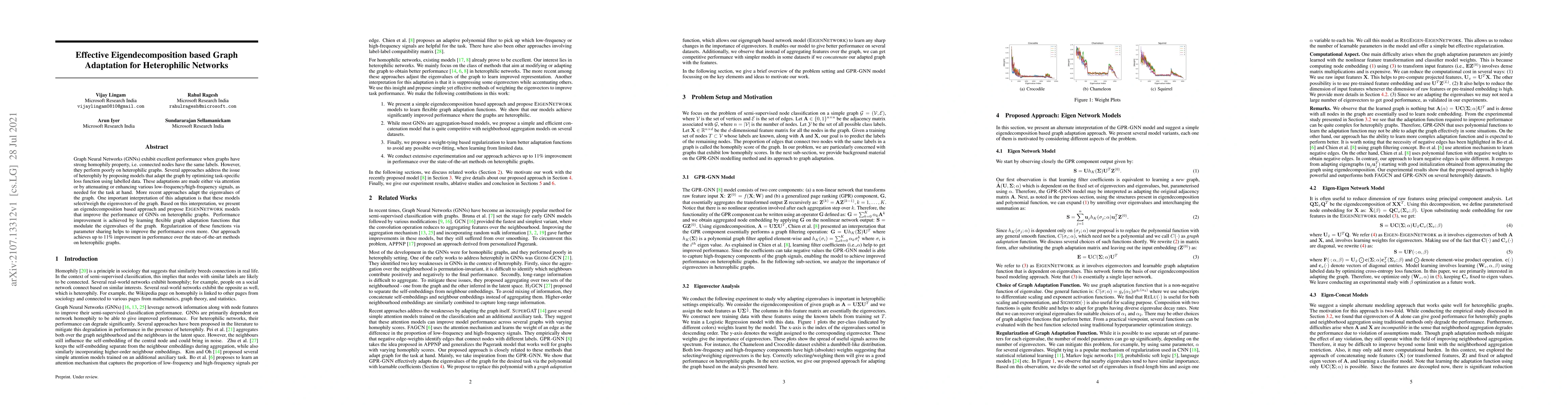 Graph Neural Networks (GNNs) exhibit excellent performance when graphs have strong homophily property, i.e. connected nodes have the same labels. However, they perform poorly on heterophilic graphs. Several approaches address the issue of heterophily by proposing models that adapt the graph by optimizing task-specific loss function using labelled data. These adaptations are made either via attention or by attenuating or enhancing various low-frequency/high-frequency signals, as needed for the task at hand. More recent approaches adapt the eigenvalues of the graph. One important interpretation of this adaptation is that these models select/weigh the eigenvectors of the graph. Based on this interpretation, we present an eigendecomposition based approach and propose EigenNetwork models that improve the performance of GNNs on heterophilic graphs. Performance improvement is achieved by learning flexible graph adaptation functions that modulate the eigenvalues of the graph. Regularization of these functions via parameter sharing helps to improve the performance even more. Our approach achieves up to 11% improvement in performance over the state-of-the-art methods on heterophilic graphs.