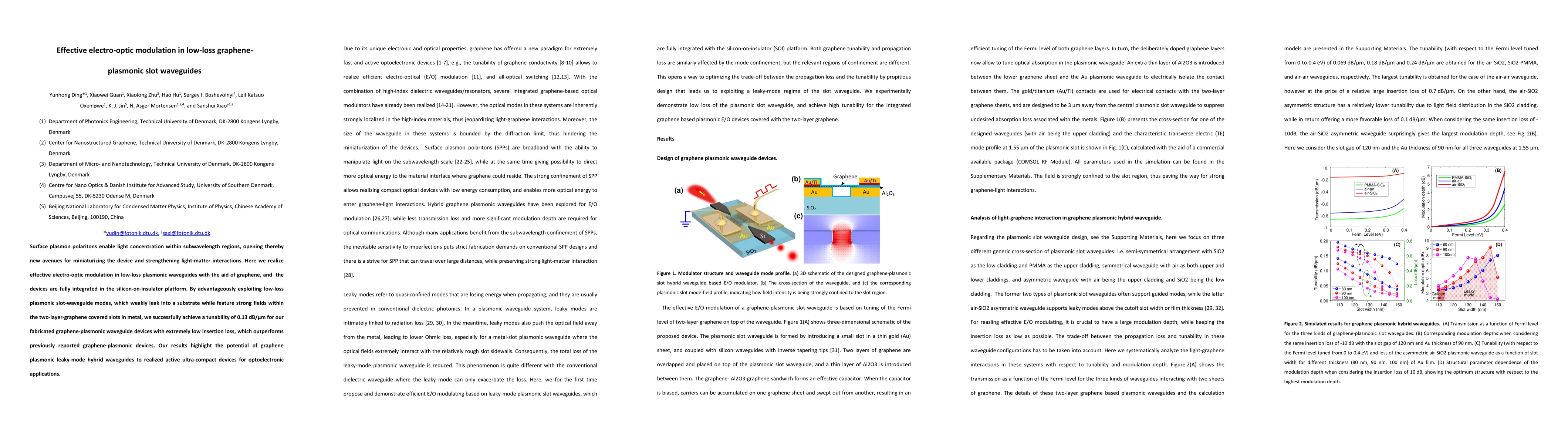 This paper demonstrates effective electro-optic modulation in low-loss graphene-plasmonic slot waveguides by leveraging surface plasmon polaritons, achieving 0.13 dB/um tunability with minimal insertion loss. The integration on a silicon-on-insulator platform highlights the potential for ultra-compact optoelectronic devices.