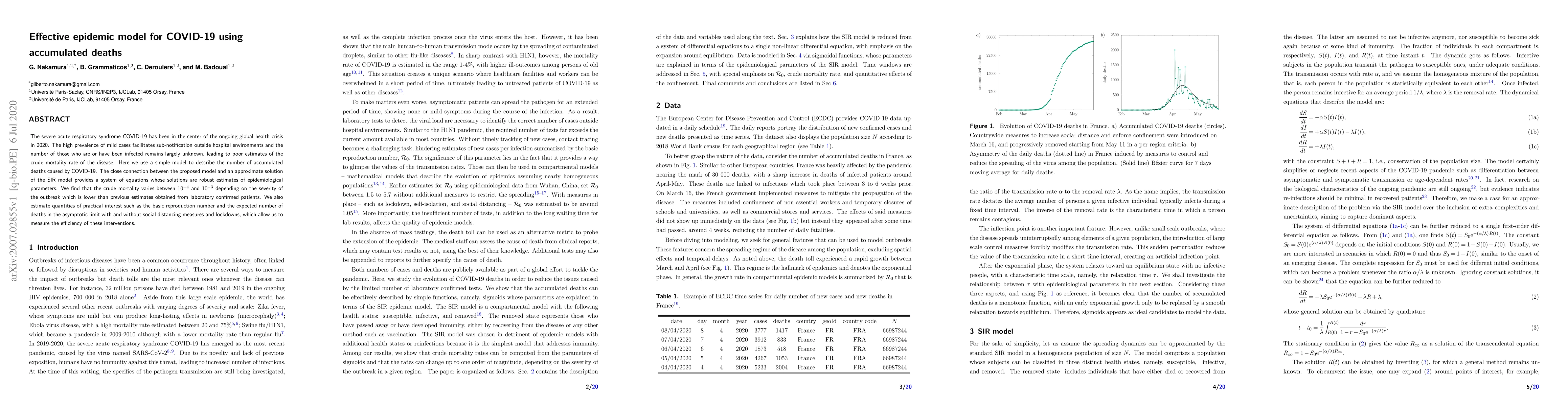 This paper proposes a simple epidemic model to estimate the number of accumulated deaths from COVID-19, finding crude mortality rates lower than previous estimates. The model estimates epidemiological parameters and assesses the effectiveness of interventions like social distancing and lockdowns.