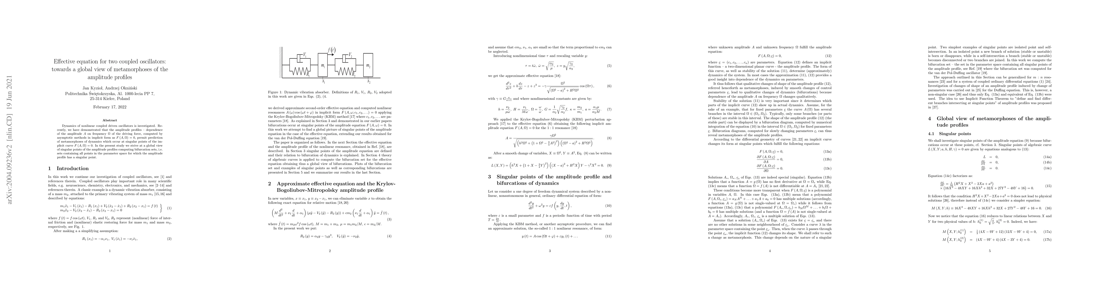 Dynamics of nonlinear coupled driven oscillators is investigated. Recently, we have demonstrated that the amplitude profiles -- dependence of the amplitude $A$ on frequency $\Omega$ of the driving force, computed by asymptotic methods in implicit form as $F\left( A,\Omega \right) =0$, permit prediction of metamorphoses of dynamics which occur at singular points of the implicit curve $F\left( A,\Omega \right) =0$. In the present study we strive at a global view of singular points of the amplitude profiles computing bifurcation sets, i.e. sets containing all points in the parameter space for which the amplitude profile has a singular point.