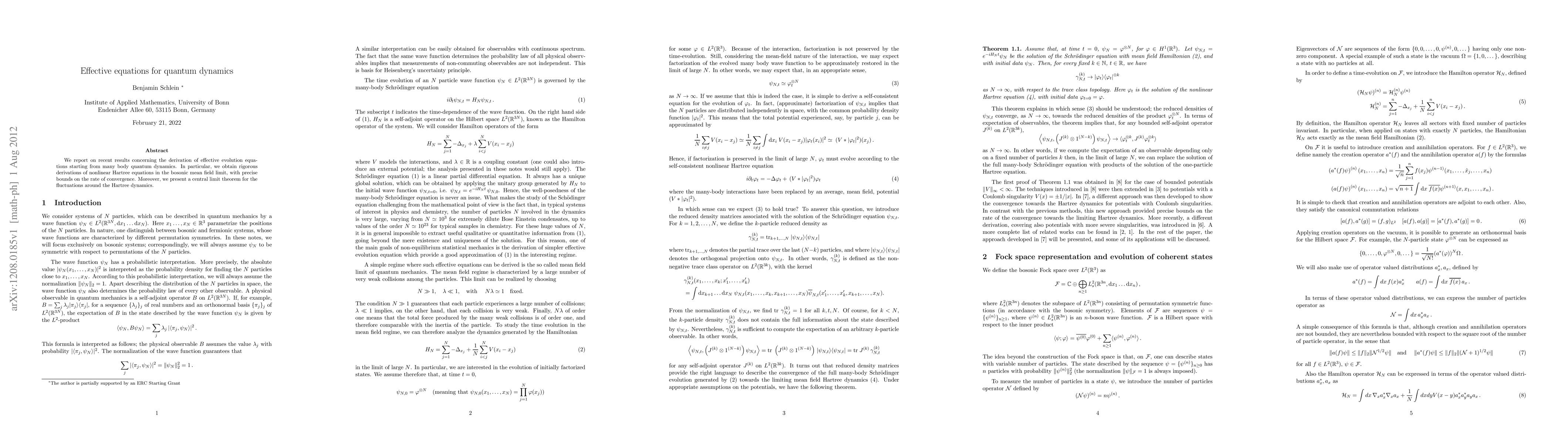 This paper derives rigorous effective evolution equations from many-body quantum dynamics, specifically obtaining nonlinear Hartree equations in the bosonic mean field limit with precise convergence bounds and presenting a central limit theorem for fluctuations around the Hartree dynamics.