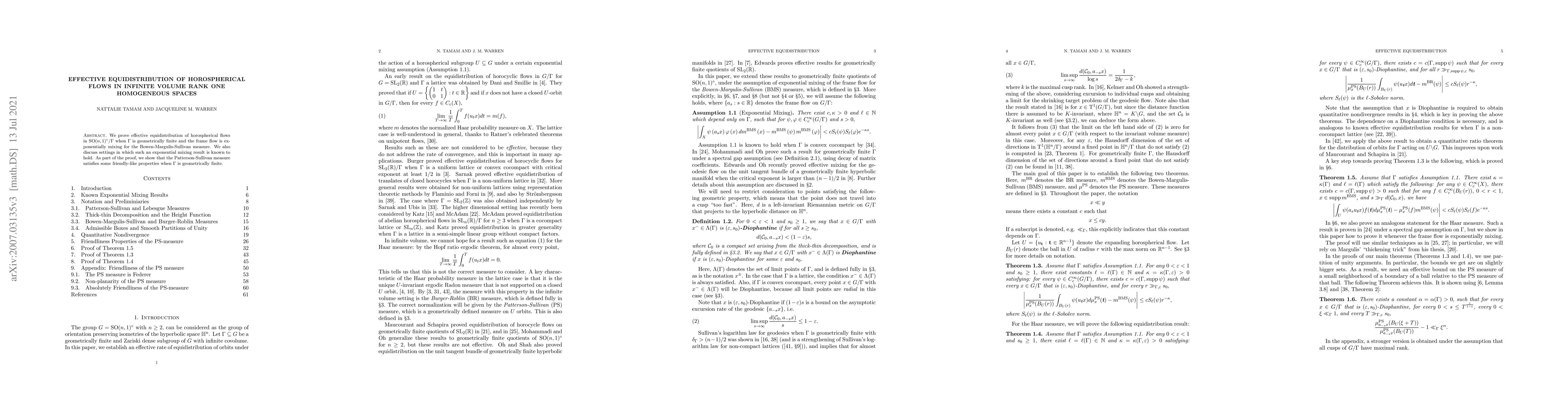 This paper proves effective equidistribution of horospherical flows in rank one homogeneous spaces under geometrically finite groups, assuming exponential mixing for the Bowen-Margulis-Sullivan measure. It also explores settings where such mixing is known and demonstrates favorable properties of the Patterson-Sullivan measure.