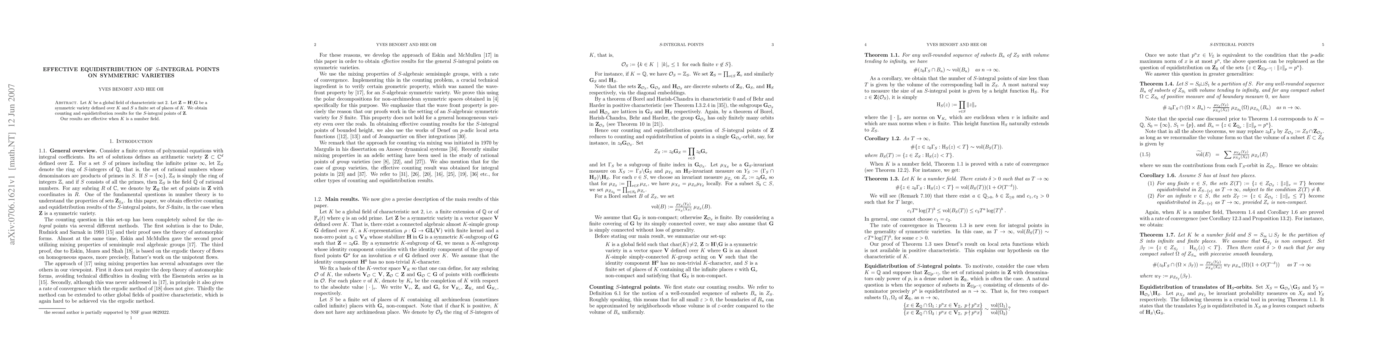This paper presents effective counting and equidistribution results for S-integral points on symmetric varieties Z over global fields K, with a focus on number fields where the results are particularly strong. The study addresses the distribution of these points relative to a finite set of places S of K.