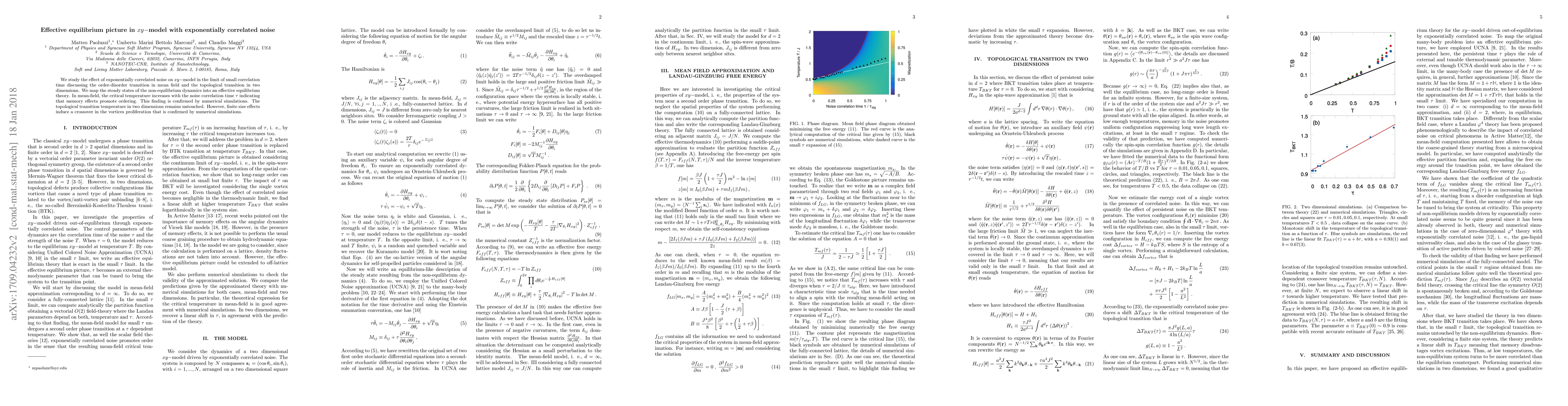 We study the effect of exponentially correlated noise on $xy-$model in the limit of small correlation time discussing the order-disorder transition in mean-field and the topological transition in two dimensions. We map the steady states of the non-equilibrium dynamics into an effective equilibrium theory. In mean-field, the critical temperature increases with the noise correlation time $\tau$ indicating that memory effects promote ordering. This finding is confirmed by numerical simulations. The topological transition temperature in two dimensions remains untouched. However, finite size effects induce a crossover in the vortices proliferation that is confirmed by numerical simulations.