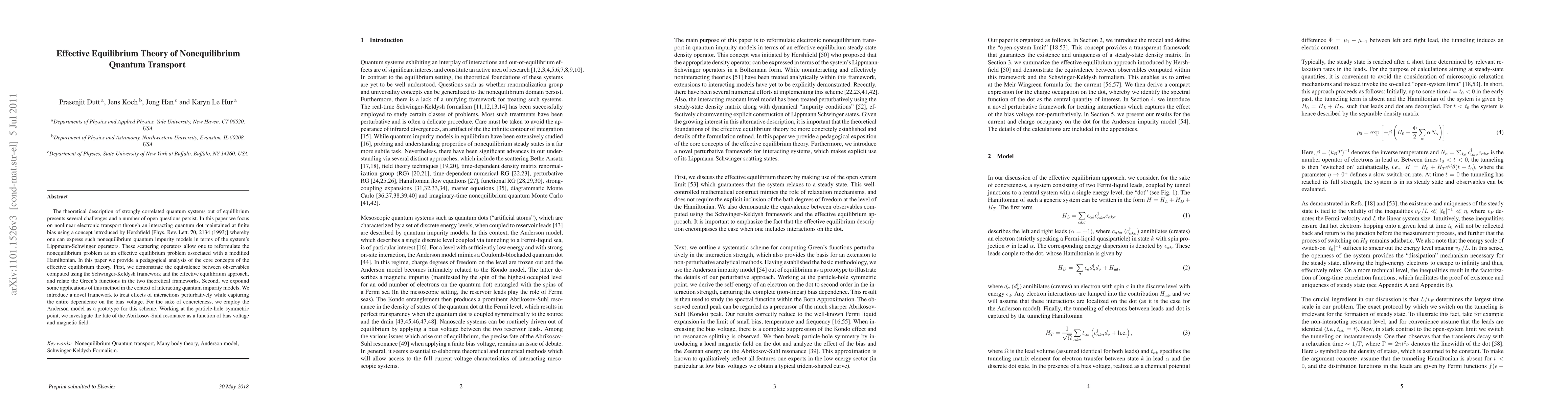 This paper develops an effective equilibrium theory for nonlinear quantum transport in strongly correlated quantum systems out of equilibrium, using the concept of Lippmann-Schwinger operators to reformulate nonequilibrium problems. It demonstrates the equivalence between the Schwinger-Keldysh framework and the effective equilibrium approach, and applies this method to the Anderson model to study the Abrikosov-Suhl resonance under varying bias voltage and magnetic field.