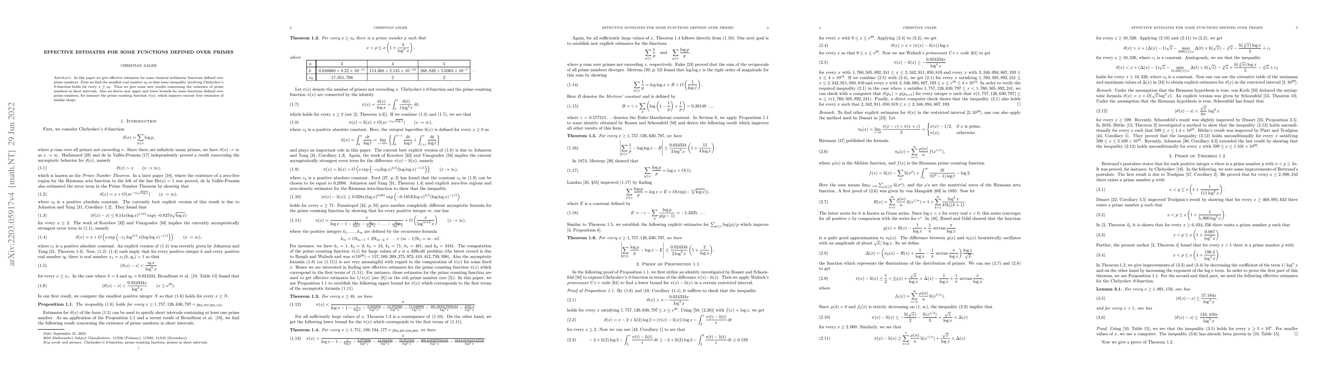 This paper provides effective estimates for classical arithmetic functions over primes, including the smallest $x_0$ for which an inequality involving Chebyshev's $\vartheta$-function holds for all $x \geq x_0$. Additionally, it offers new results on primes in short intervals and improves current upper and lower bounds for functions like the prime counting function $\pi(x)$.