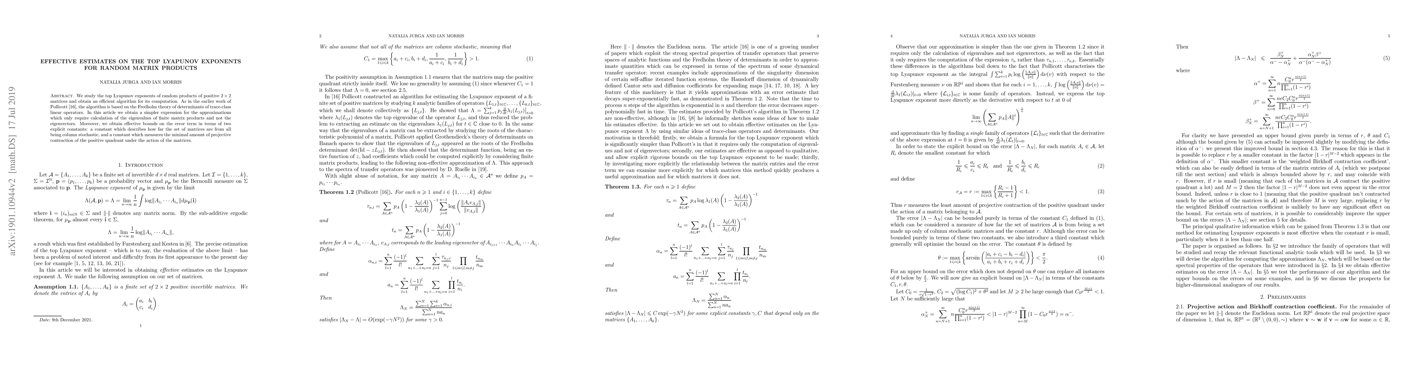 We study the top Lyapunov exponents of random products of positive $2 \times 2$ matrices and obtain an efficient algorithm for its computation. As in the earlier work of Pollicott, the algorithm is based on the Fredholm theory of determinants of trace-class linear operators. In this article we obtain a simpler expression for the approximations which only require calculation of the eigenvalues of finite matrix products and not the eigenvectors. Moreover, we obtain effective bounds on the error term in terms of two explicit constants: a constant which describes how far the set of matrices are from all being column stochastic, and a constant which measures the minimal amount of projective contraction of the positive quadrant under the action of the matrices.