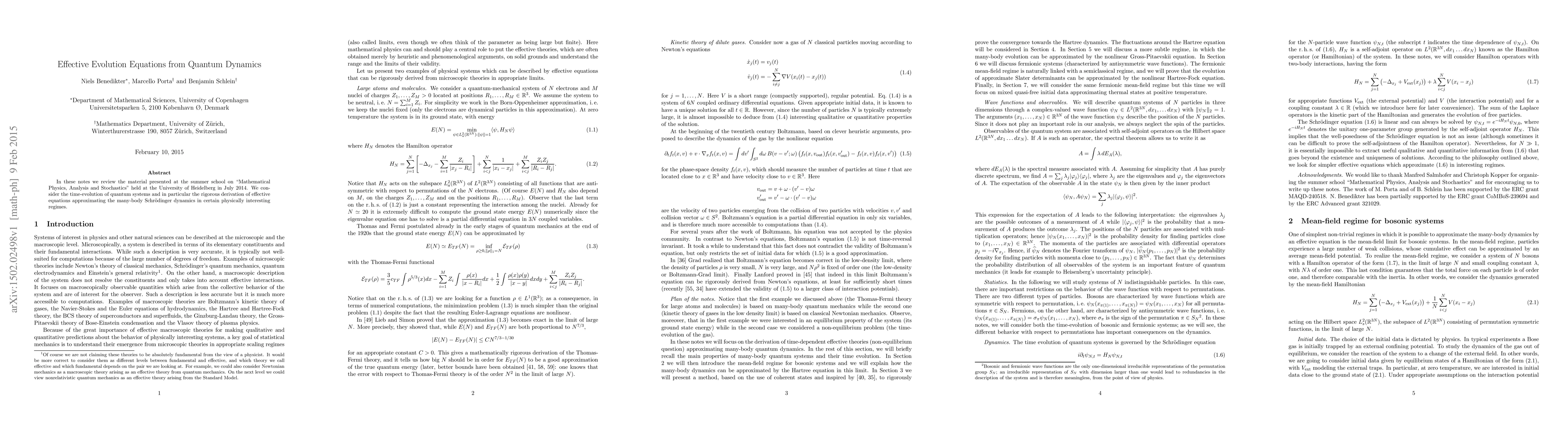 Summary: This paper reviews material from a summer school on mathematical physics, focusing on the rigorous derivation of effective equations that approximate the many-body Schrödinger dynamics for quantum systems in specific physical regimes. The goal is to simplify the complex dynamics of quantum many-body systems.