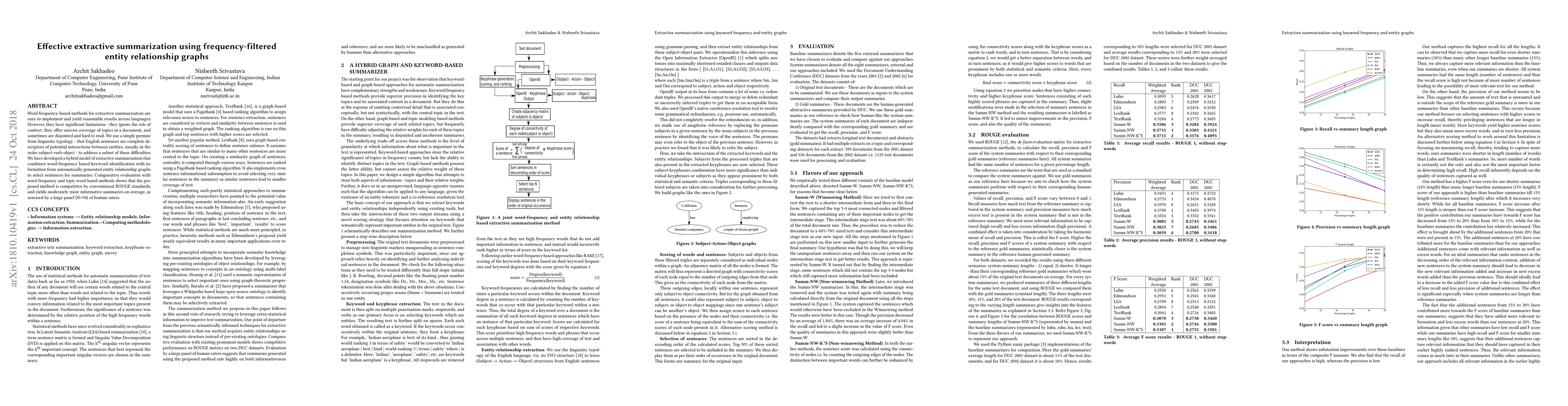 Word frequency-based methods for extractive summarization are easy to implement and yield reasonable results across languages. However, they have significant limitations - they ignore the role of context, they offer uneven coverage of topics in a document, and sometimes are disjointed and hard to read. We use a simple premise from linguistic typology - that English sentences are complete descriptors of potential interactions between entities, usually in the order subject-verb-object - to address a subset of these difficulties. We have developed a hybrid model of extractive summarization that combines word-frequency based keyword identification with information from automatically generated entity relationship graphs to select sentences for summaries. Comparative evaluation with word-frequency and topic word-based methods shows that the proposed method is competitive by conventional ROUGE standards, and yields moderately more informative summaries on average, as assessed by a large panel (N=94) of human raters.