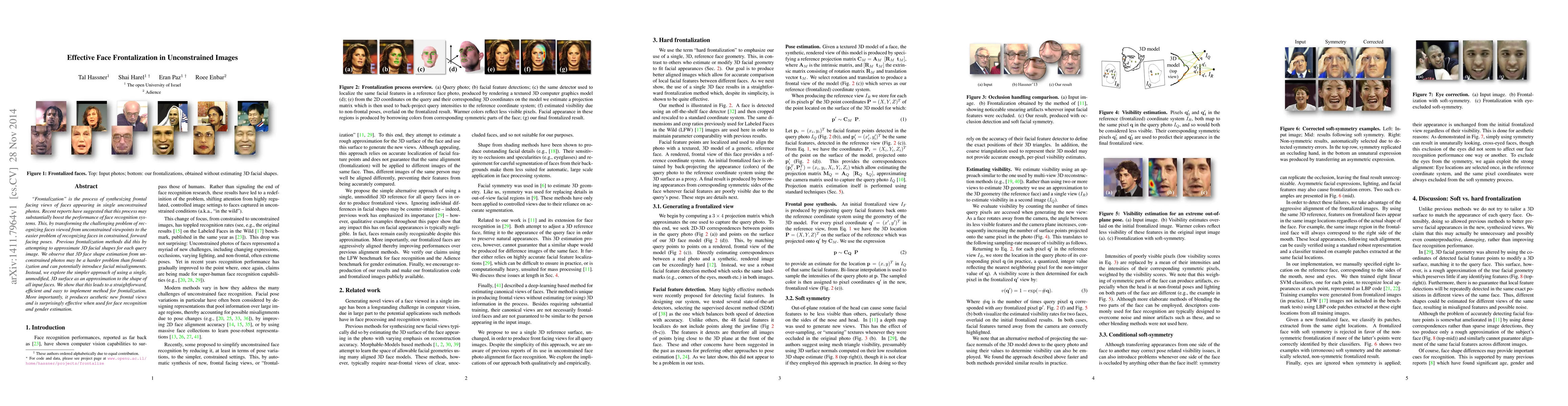 The paper proposes a simple yet effective method for face frontalization in unconstrained images using a single, unmodified 3D surface as an approximation for all input faces, avoiding complex 3D shape estimations.