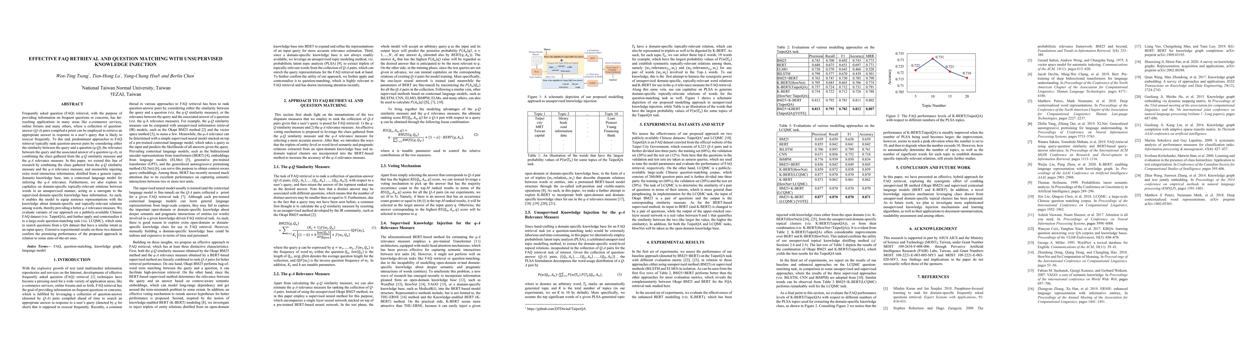 This paper proposes a novel approach to FAQ retrieval that uses unsupervised knowledge injection and contextual language models to improve question matching and answer relevance.
