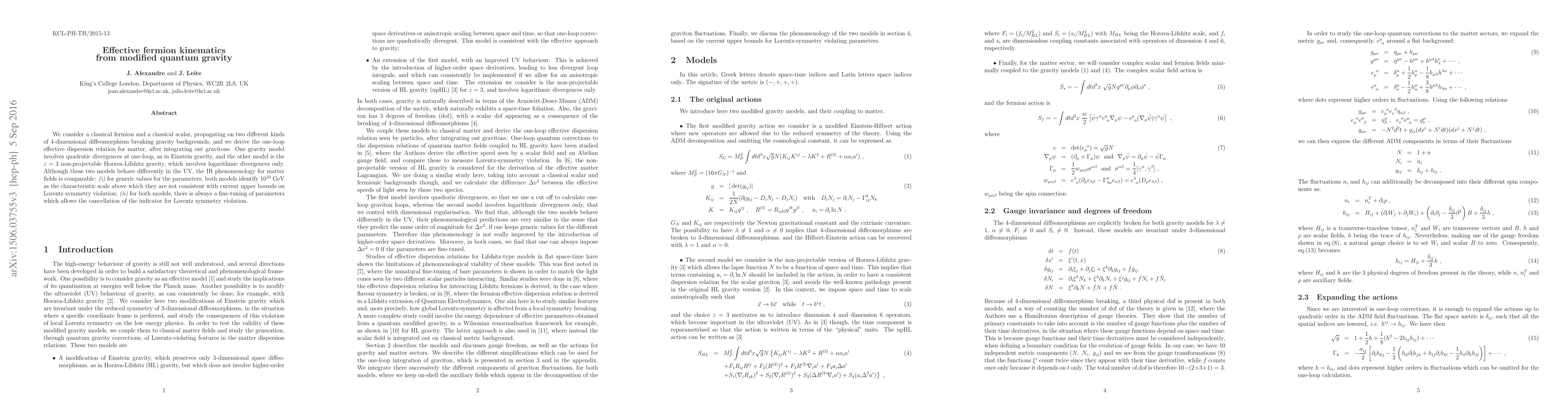 We consider a classical fermion and a classical scalar, propagating on two different kinds of 4-dimensional diffeomorphism breaking gravity backgrounds, and we derive the one-loop effective dispersion relation for matter, after integrating out gravitons. One gravity model involves quadratic divergences at one-loop, as in Einstein gravity, and the other model is the $z=3$ non-projectable Horava-Lifshitz gravity, which involves logarithmic divergences only. Although these two models behave differently in the UV, the IR phenomenology for matter fields is comparable: {\it(i)} for generic values for the parameters, both models identify $10^{10}$ GeV as the typical characteristic scale above which they are not consistent with current upper bounds on Lorentz symmetry violation; {\it(ii)} on the other hand there is always, for both models, a fine-tuning of parameters which allows the cancellation of the indicator for Lorentz symmetry violation.