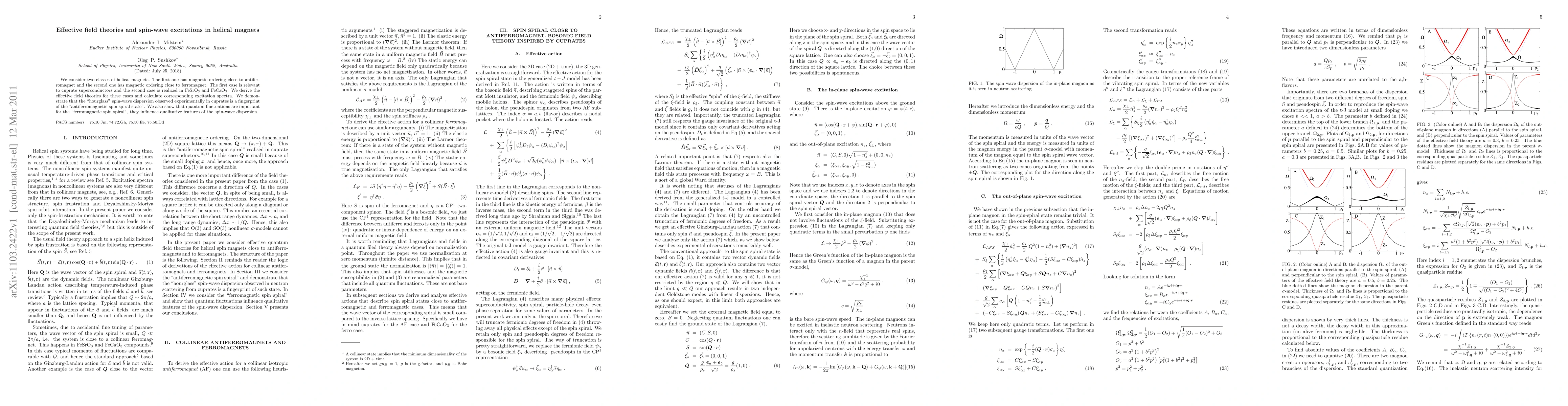 We consider two classes of helical magnets. The first one has magnetic ordering close to antiferromagnet and the second one has magnetic ordering close to ferromagnet. The first case is relevant to cuprate superconductors and the second case is realized in FeSrO$_3$ and FeCaO$_3$. We derive the effective field theories for these cases and calculate corresponding excitation spectra. We demonstrate that the "hourglass" spin-wave dispersion observed experimentally in cuprates is a fingerprint of the "antiferromagnetic spin spiral state". We also show that quantum fluctuations are important for the "ferromagnetic spin spiral", they influence qualitative features of the spin-wave dispersion.
