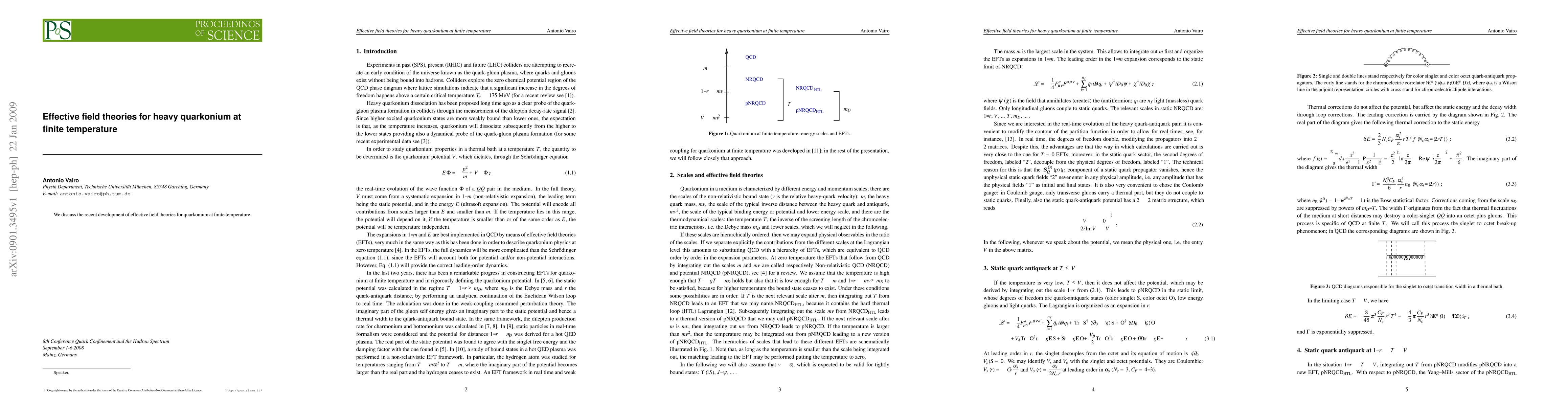 We discuss the recent development of effective field theories for quarkonium at finite temperature.