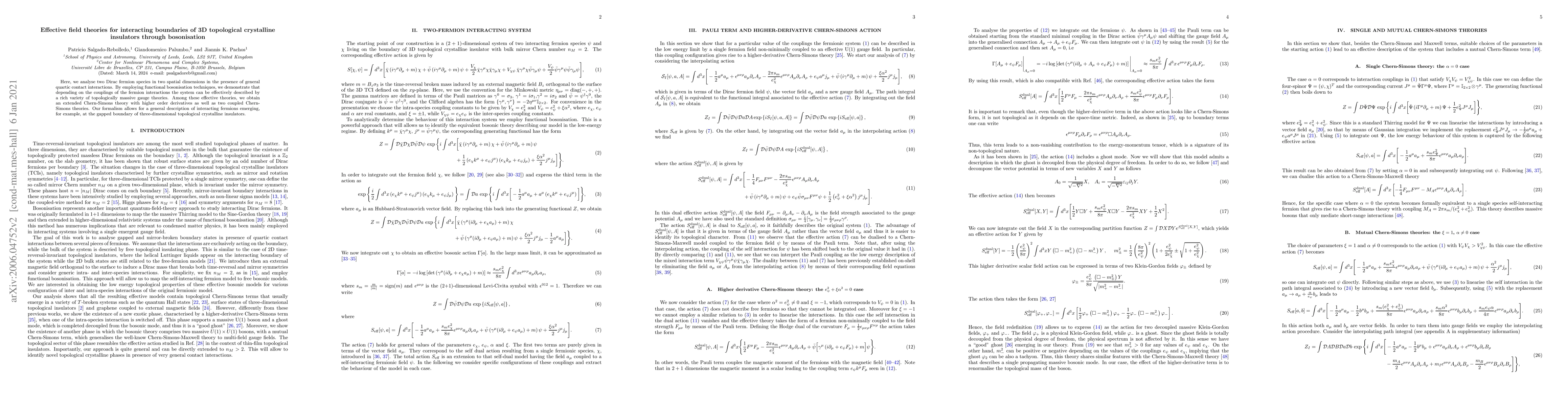 Here, we analyse two Dirac fermion species in two spatial dimensions in the presence of general quartic contact interactions. By employing functional bosonisation techniques, we demonstrate that depending on the couplings of the fermion interactions the system can be effectively described by a rich variety of topologically massive gauge theories. Among these effective theories, we obtain an extended Chern-Simons theory with higher order derivatives as well as two coupled Chern-Simons theories. Our formalism allows for a general description of interacting fermions emerging, for example, at the gapped boundary of three-dimensional topological crystalline insulators.