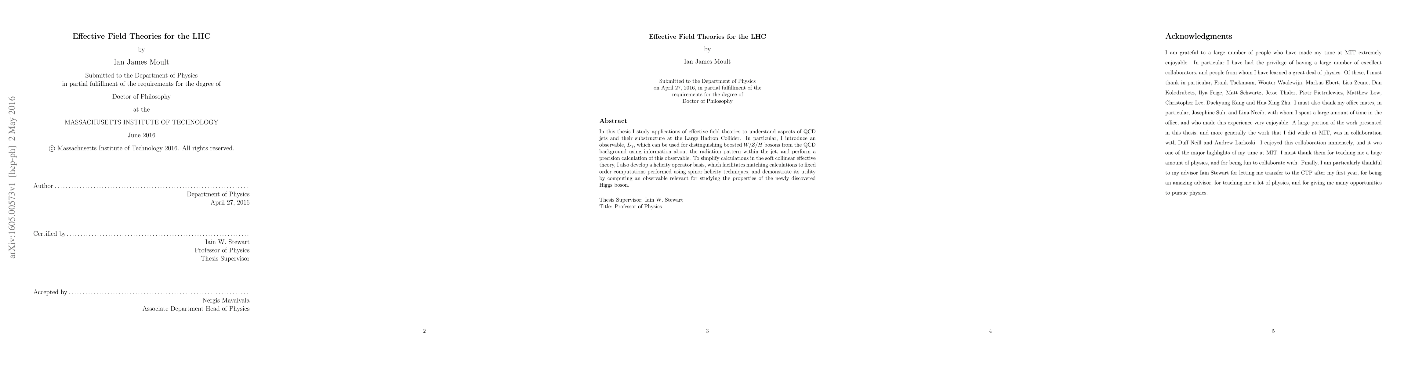 This paper explores the application of effective field theories to analyze QCD jets and their substructure at the LHC, introducing a new observable $D_2$ to distinguish boosted $W/Z/H$ bosons from QCD background. It also develops a helicity operator basis to simplify calculations in the soft collinear effective theory, demonstrating its utility in studying the Higgs boson.