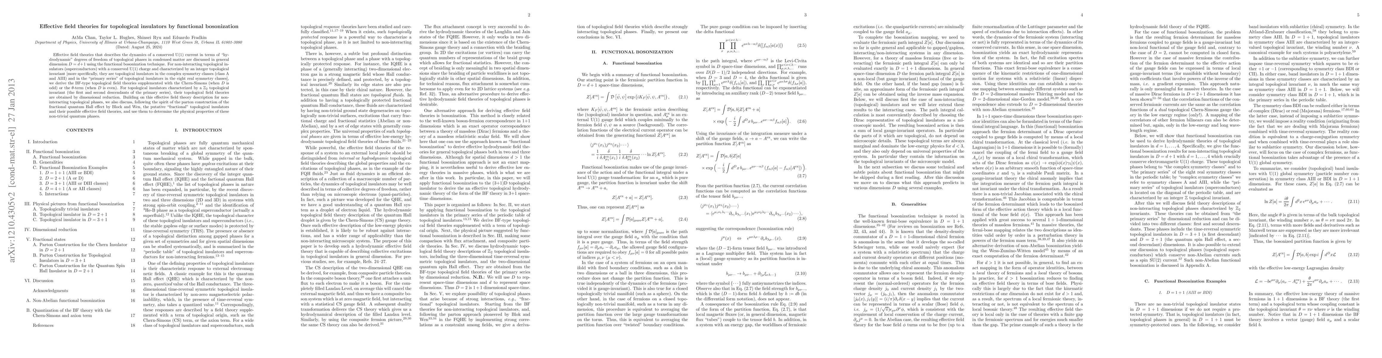 This paper develops effective field theories for topological insulators using functional bosonization, focusing on conserved U(1) currents and hydrodynamic degrees of freedom. It derives BF-type topological field theories supplemented with Chern-Simons or $\theta$-terms for non-interacting topological insulators, and discusses fractional topological insulators and their effective field theories.