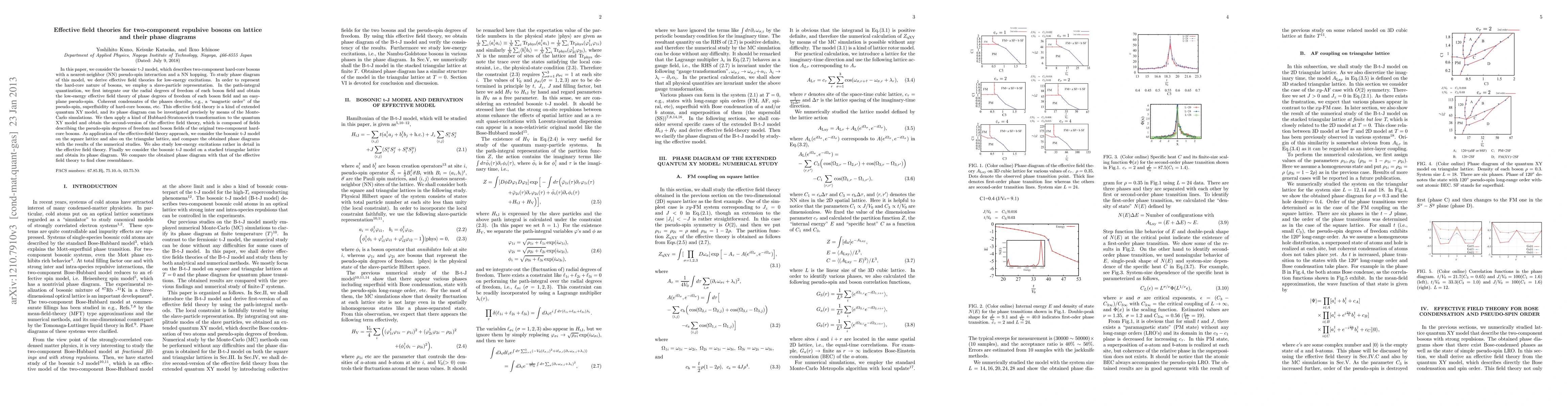 In this paper, we consider the bosonic t-J model, which describes two-component hard-core bosons with a nearest-neighbor (NN) pseudo-spin interaction and a NN hopping. To study phase diagram of this model, we derive effective field theories for low-energy excitations. In order to represent the hard-core nature of bosons, we employ a slave-particle representation. In the path-integral quantization, we first integrate our the radial degrees of freedom of each boson field and obtain the low-energy effective field theory of phase degrees of freedom of each boson field and an easy-plane pseudo-spin. Coherent condensates of the phases describe, e.g., a "magnetic order" of the pseudo-spin, superfluidity of hard-core bosons, etc. This effective field theory is a kind of extended quantum XY model, and its phase diagram can be investigated precisely by means of the Monte-Carlo simulations. We then apply a kind of Hubbard-Stratonovich transformation to the quantum XY model and obtain the second-version of the effective field theory, which is composed of fields describing the pseudo-spin degrees of freedom and boson fields of the original two-component hard-core bosons. As application of the effective-field theory approach, we consider the bosonic t-J model on the square lattice and also on the triangular lattice, and compare the obtained phase diagrams with the results of the numerical studies. We also study low-energy excitations rather in detail in the effective field theory. Finally we consider the bosonic t-J model on a stacked triangular lattice and obtain its phase diagram. We compare the obtained phase diagram with that of the effective field theory to find close resemblance.