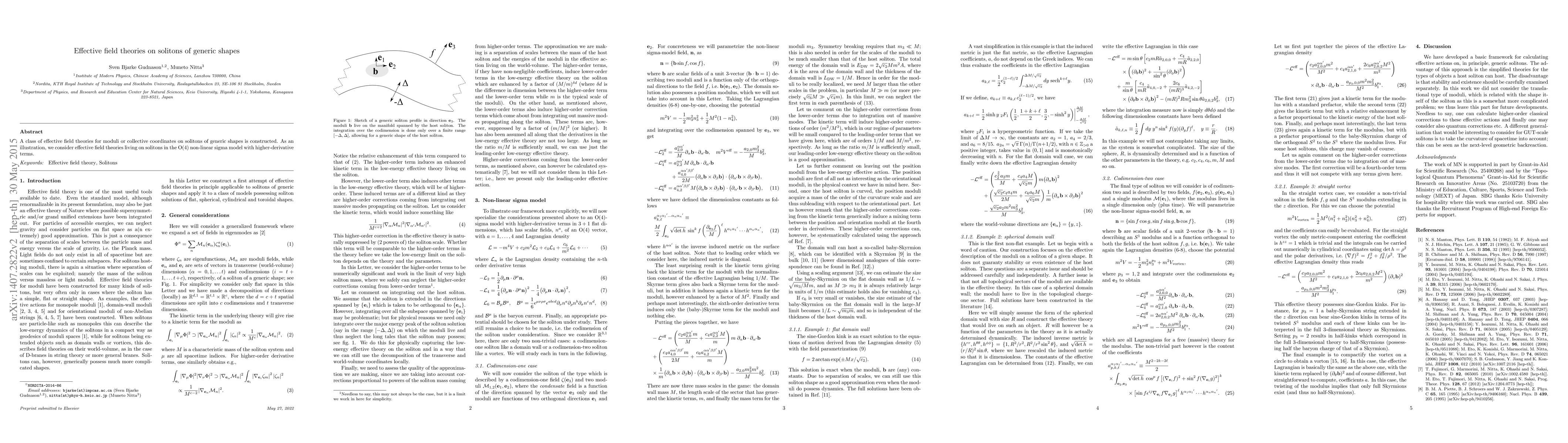 This paper constructs effective field theories for solitons with generic shapes, focusing on moduli or collective coordinates. It specifically examines these theories in the context of solitons in the O(4) non-linear sigma model with higher-derivative terms.