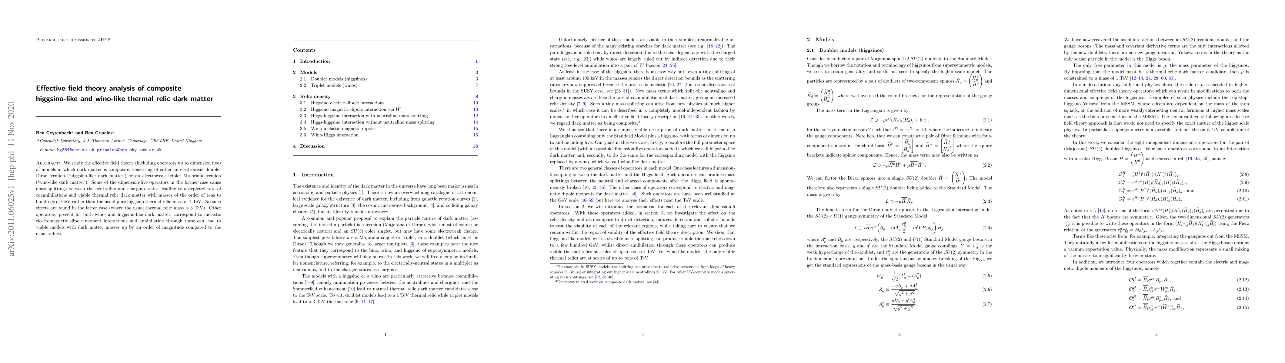 We study the effective field theory (including operators up to dimension five) of models in which dark matter is composite, consisting of either an electroweak doublet Dirac fermion (`higgsino-like dark matter') or an electroweak triplet Majorana fermion (`wino-like dark matter'). Some of the dimension-five operators in the former case cause mass splittings between the neutralino and chargino states, leading to a depleted rate of coannihilations and viable thermal relic dark matter with masses of the order of tens to hundreds of GeV rather than the usual pure higgsino thermal relic mass of 1 TeV. No such effects are found in the latter case (where the usual thermal relic mass is 3 TeV). Other operators, present for both wino- and higgsino-like dark matter, correspond to inelastic electromagnetic dipole moment interactions and annihilation through these can lead to viable models with dark matter masses up by an order of magnitude compared to the usual values.
