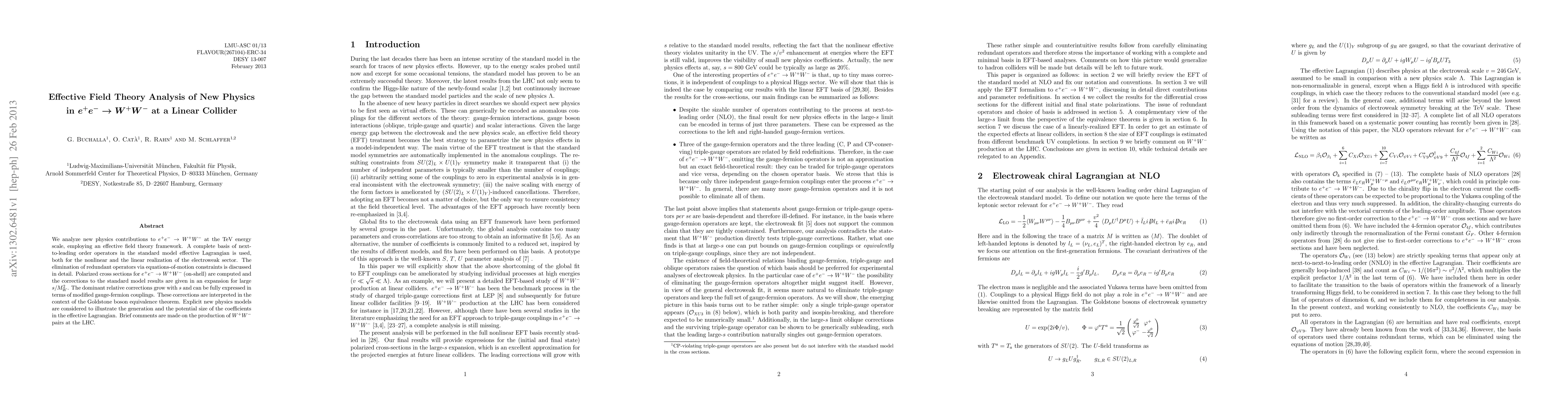 We analyze new physics contributions to $e^+e^-\to W^+W^-$ at the TeV energy scale, employing an effective field theory framework. A complete basis of next-to-leading order operators in the standard model effective Lagrangian is used, both for the nonlinear and the linear realization of the electroweak sector. The elimination of redundant operators via equations-of-motion constraints is discussed in detail. Polarized cross sections for $e^+e^-\to W^+W^-$ (on-shell) are computed and the corrections to the standard model results are given in an expansion for large $s/M^2_W$. The dominant relative corrections grow with $s$ and can be fully expressed in terms of modified gauge-fermion couplings. These corrections are interpreted in the context of the Goldstone boson equivalence theorem. Explicit new physics models are considered to illustrate the generation and the potential size of the coefficients in the effective Lagrangian. Brief comments are made on the production of $W^+W^-$ pairs at the LHC.