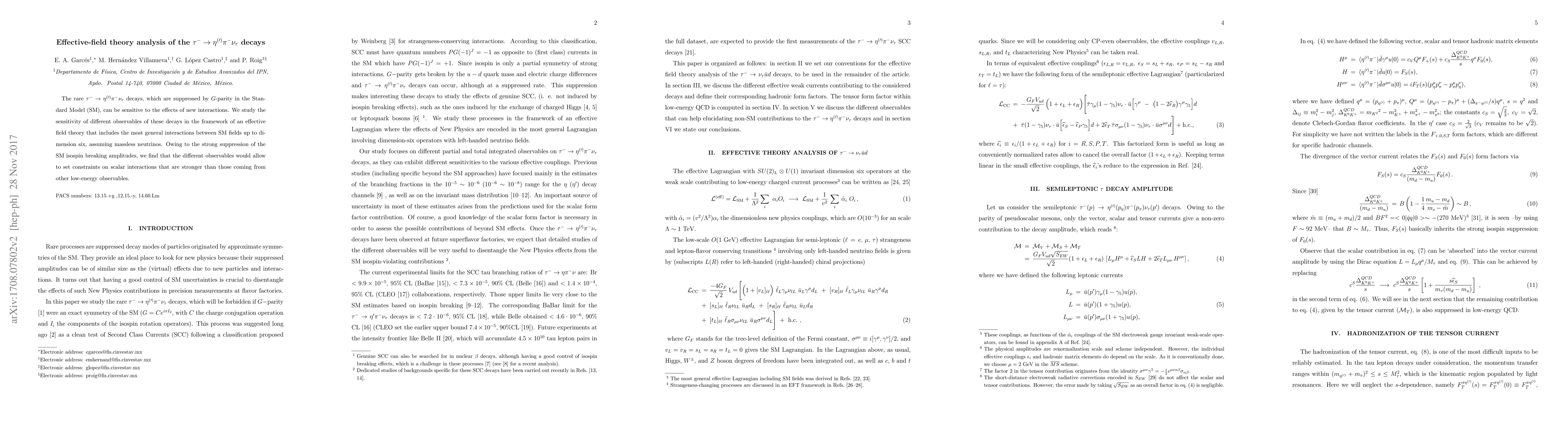 This paper investigates the rare $\tau^- \to \eta^{(\prime)} \pi^- \nu_\tau$ decays using an effective field theory framework, revealing that these decays are highly sensitive to new interactions beyond the Standard Model. The study finds that these decays provide stronger constraints on scalar interactions than other low-energy observables.