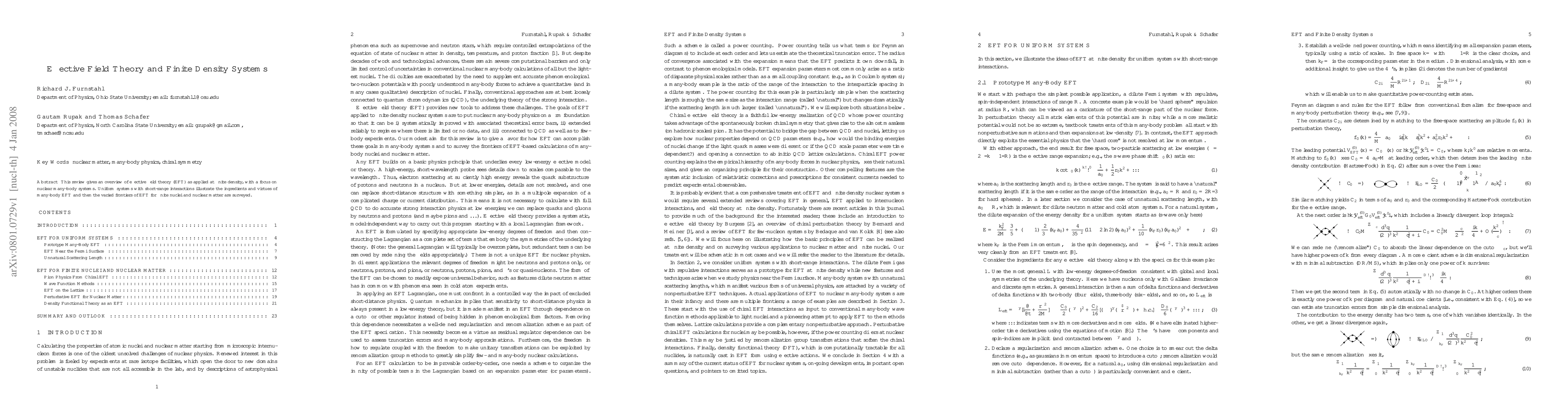 This review provides an overview of effective field theory (EFT) applied to finite density systems, particularly nuclear many-body systems, highlighting the methods and benefits of many-body EFT and exploring its applications to finite nuclei and nuclear matter.