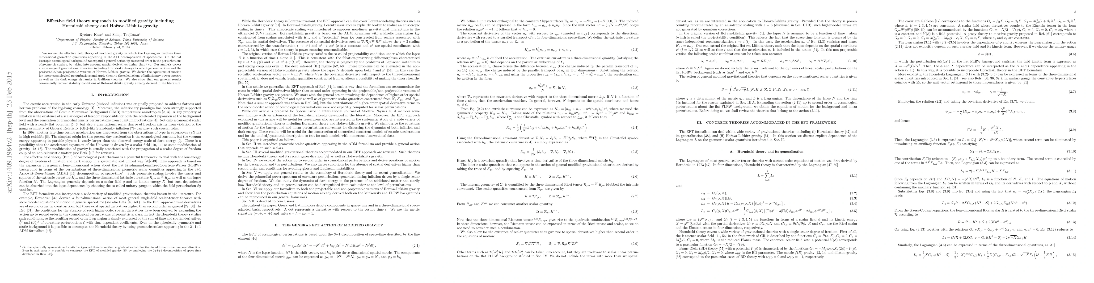 We review the effective field theory of modified gravity in which the Lagrangian involves three dimensional geometric quantities appearing in the 3+1 decomposition of space-time. On the flat isotropic cosmological background we expand a general action up to second order in the perturbations of geometric scalars, by taking into account spatial derivatives higher than two. Our analysis covers a wide range of gravitational theories-- including Horndeski theory/its recent generalizations and the projectable/non-projectable versions of Ho\v{r}ava-Lifshitz gravity. We derive the equations of motion for linear cosmological perturbations and apply them to the calculations of inflationary power spectra as well as the dark energy dynamics in Galileon theories. We also show that our general results conveniently recover stability conditions of Ho\v{r}ava-Lifshitz gravity already derived in the literature.