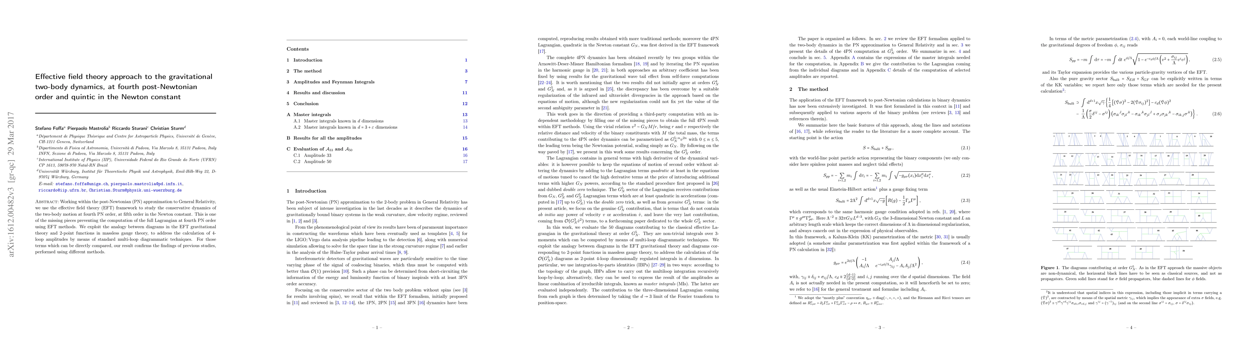 Working within the post-Newtonian (PN) approximation to General Relativity, we use the effective field theory (EFT) framework to study the conservative dynamics of the two-body motion at fourth PN order, at fifth order in the Newton constant. This is one of the missing pieces preventing the computation of the full Lagrangian at fourth PN order using EFT methods. We exploit the analogy between diagrams in the EFT gravitational theory and 2-point functions in massless gauge theory, to address the calculation of 4-loop amplitudes by means of standard multi-loop diagrammatic techniques. For those terms which can be directly compared, our result confirms the findings of previous studies, performed using different methods.