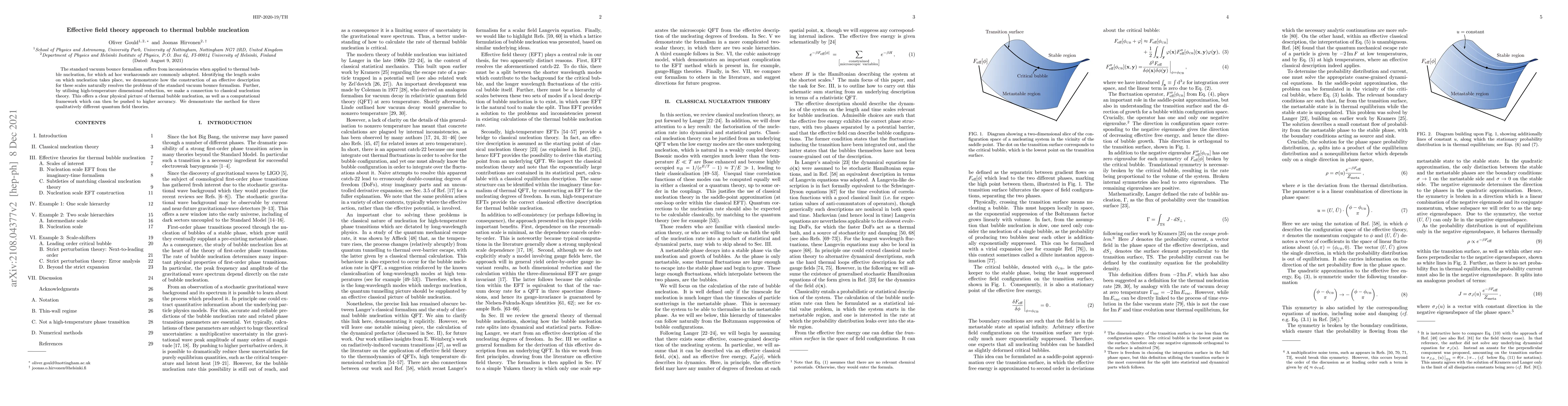 This paper proposes an effective field theory approach to resolve inconsistencies in thermal bubble nucleation, addressing the limitations of the standard vacuum bounce formalism. By constructing an effective description and utilizing high-temperature dimensional reduction, it connects to classical nucleation theory, providing a clearer physical picture and a computational framework applicable to various quantum field theories.