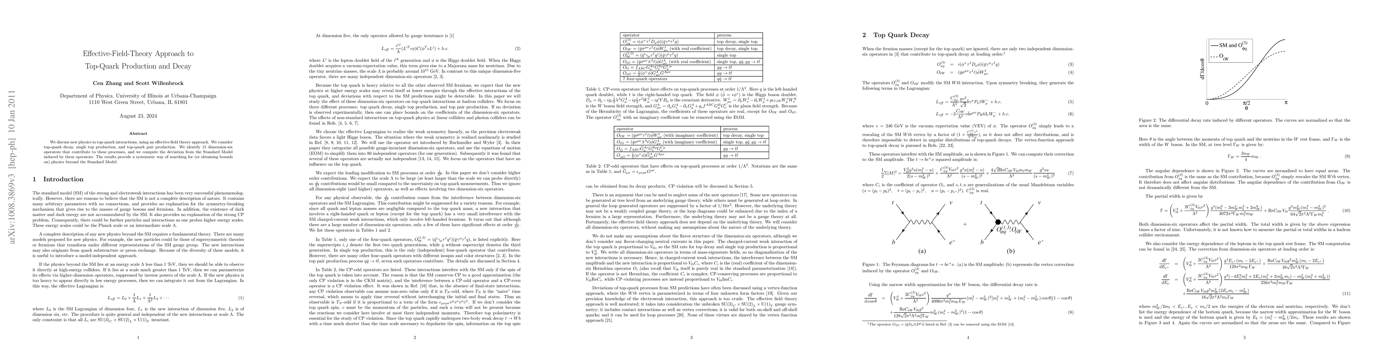 This paper employs an effective field theory approach to study top-quark interactions, identifying 15 dimension-six operators that affect top-quark decay, single top production, and pair production, thereby offering a systematic method to search for or set limits on physics beyond the Standard Model.