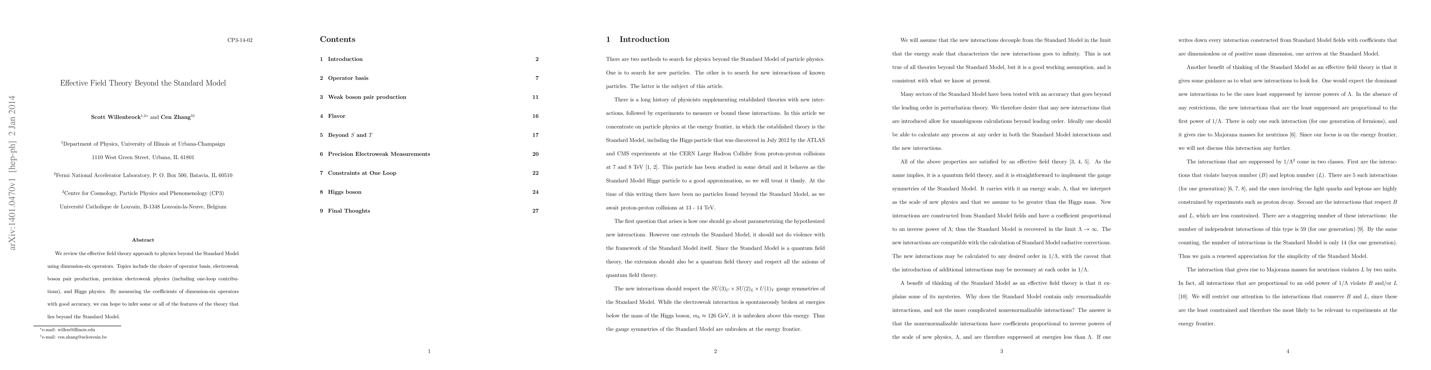 This paper reviews the effective field theory approach to physics beyond the Standard Model, focusing on dimension-six operators. It discusses the choice of operator basis, electroweak boson pair production, precision electroweak physics, and Higgs physics, aiming to infer features of new theories through precise measurements of operator coefficients.