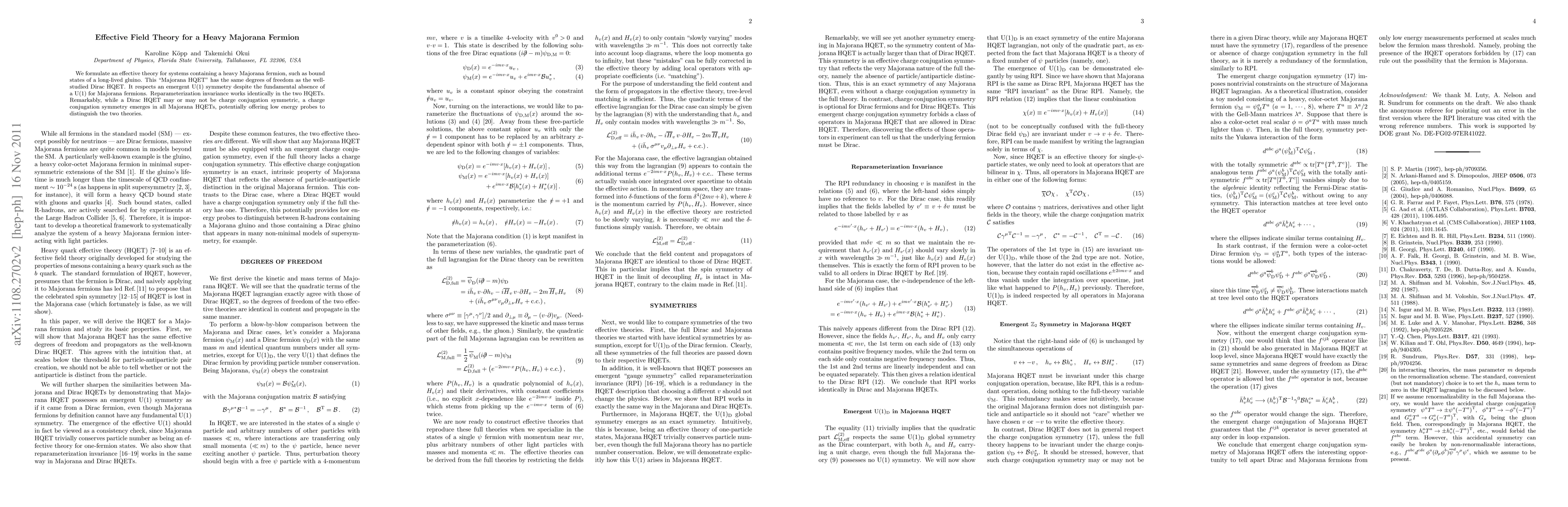 We formulate an effective theory for systems containing a heavy Majorana fermion, such as bound states of a long-lived gluino. This "Majorana HQET" has the same degrees of freedom as the well-studied Dirac HQET. It respects an emergent U(1) symmetry despite the fundamental absence of a U(1) for Majorana fermions. Reparameterization invariance works identically in the two HQETs. Remarkably, while a Dirac HQET may or may not be charge conjugation symmetric, a charge conjugation symmetry emerges in all Majorana HQETs, potentially offering low energy probes to distinguish the two theories.