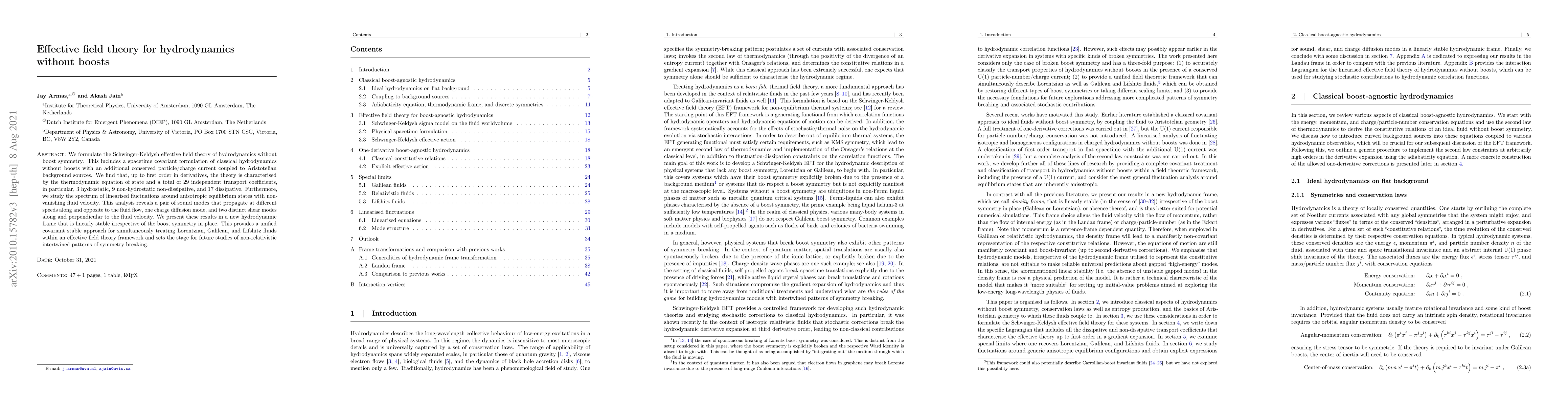 We formulate the Schwinger-Keldysh effective field theory of hydrodynamics without boost symmetry. This includes a spacetime covariant formulation of classical hydrodynamics without boosts with an additional conserved particle/charge current coupled to Aristotelian background sources. We find that, up to first order in derivatives, the theory is characterised by the thermodynamic equation of state and a total of 29 independent transport coefficients, in particular, 3 hydrostatic, 9 non-hydrostatic non-dissipative, and 17 dissipative. Furthermore, we study the spectrum of linearised fluctuations around anisotropic equilibrium states with non-vanishing fluid velocity. This analysis reveals a pair of sound modes that propagate at different speeds along and opposite to the fluid flow, one charge diffusion mode, and two distinct shear modes along and perpendicular to the fluid velocity. We present these results in a new hydrodynamic frame that is linearly stable irrespective of the boost symmetry in place. This provides a unified covariant stable approach for simultaneously treating Lorentzian, Galilean, and Lifshitz fluids within an effective field theory framework and sets the stage for future studies of non-relativistic intertwined patterns of symmetry breaking.